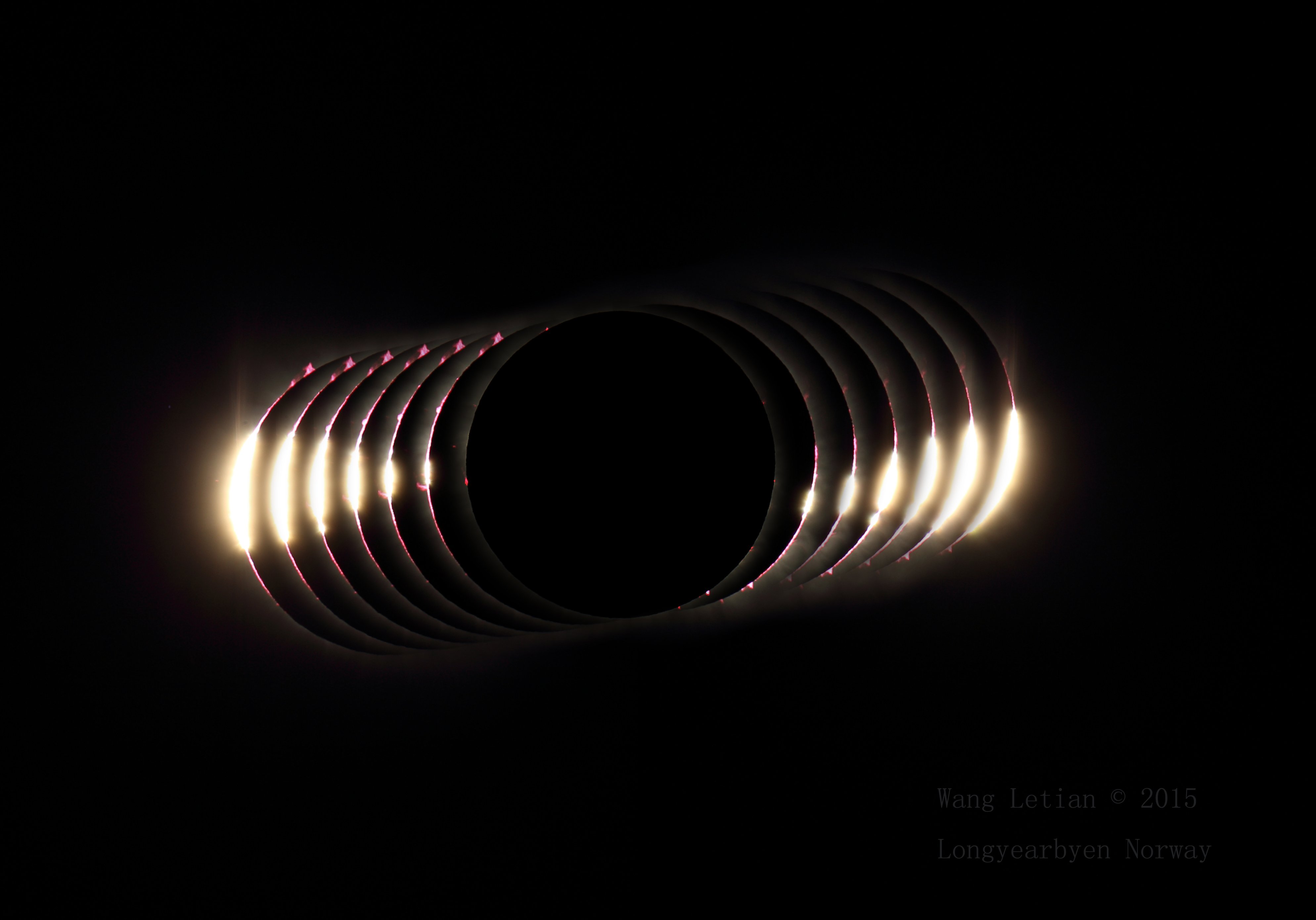 Near the March 20 equinox the cold clear sky over Longyearbyen, Norway, planet Earth held an engaging sight, a total eclipse of the Sun. The New Moon's silhouette at stages just before and after the three minute long total phase seems to sprout glistening diamonds and bright beads in this time lapse composite of the geocentric celestial event. The last and first glimpses of the solar disk with the lunar limb surrounded by the glow of the Sun's inner corona give the impression of a diamond ring in the sky. At the boundaries of totality, sunlight streaming through valleys in the irregular terrain along the Moon's edge, produces an effect known as Baily's Beads, named after English astronomer Francis Baily who championed an explanation for the phenomenon in 1836. This sharp composition also shows off the array of pinkish solar prominences lofted above the edge of the eclipsed Sun.