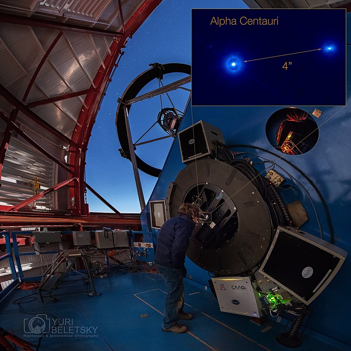 Did you ever want to just look through the eyepiece of a large telescope in space? If you could, you would see a sharp view that was diffraction limited. Unaffected by atmospheric blurring that ultimately plagues earthbound observers, the angular resolution of your diffraction limited view would be determined only by the wavelength of light and diameter of the telescope lens or mirror; the larger the diameter, the sharper the image. Still, in this working earth-based snapshot a new active adaptive optics system (MagAO) is being used to cancel out the atmospheric blurring in a visual observation of famous double star system Alpha Centauri. Testing the system at the eyepiece of the 6.5 meter diameter Magellan Clay Telescope at Las Campanas Observatory, astronomer Laird Close is enjoying a historic diffraction limited view (inset) and the wide apparent separation of the close binary star system ... without traveling to low earth orbit.