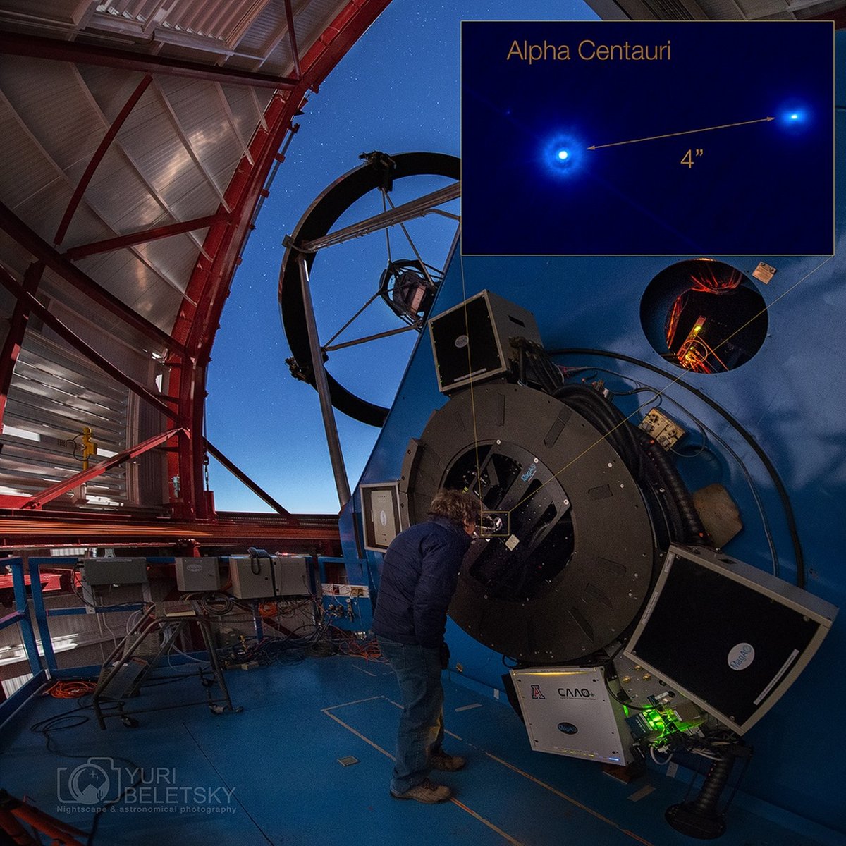 Hiç uzaydaki büyük bir teleskobun okülerinden bakmayı istediniz mi? Bunu yapabilseydiniz, kırınım sınırına kadar keskin bir görüntü görürdünüz. Yeryüzündeki gözlemcilerin başına dert olan atmosferik bulanıklık devre dışı kaldığında, kırınım sınırındaki görüntünüzün açısal çözünürlüğünü yalnızca ışığın dalga boyu ile teleskobun mercek ya da aynasının çapı belirlerdi; çap büyüdükçe görüntü de keskinleşirdi. Yine de bu çalışmada, yer tabanlı bu karede, ünlü çift yıldız sistemi Alpha Centauri’nin görsel gözleminde atmosferin bulanıklaştırıcı etkisini bastırmak için yeni ve etkin bir uyarlamalı optik sistemi (MagAO) kullanılıyor. Las Campanas Gözlemevi’ndeki 6,5 metre çaplı Magellan Clay Teleskobu’nun okülerinde sistemi sınayan astronom Laird Close, tarihi bir kırınım sınırlı görüntünün (küçük ek) ve birbirine yakın bu ikili yıldız sisteminin görece geniş görünen ayrımının keyfini çıkarıyor... hem de alçak Dünya yörüngesine gitmeden.
