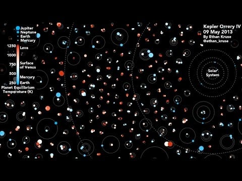 Ötegezegen avcısı Kepler görevinin, çok gezegenli sistemler için aday ve doğrulanmış toplamı; 685 uzak yıldızın çevresinde dolanan 1.705 dünyaya ulaşıyor. Bu ötegezegen yörüngelerinin hepsini aynı ölçeğe getirip göreli yörünge hareketlerini izlerseniz Kepler Orrery IV ortaya çıkar. Gezegenler görünebilsin diye boyutları ölçekli gösterilmiyor. Ama hipnotik videoda Güneş Sistemi’ndeki gezegenlerin yörüngeleri (kesik çizgiler) ölçeğe uygun biçimde eklenmiş. Kepler elbette ötegezegenleri, gezegen yıldızının önünden geçerken ışığın çok az sönmesini arayan gezegen geçişleriyle saptıyor. Zamanı sıkıştırılmış videoda Kepler’in çok gezegenli sistemlerinin yörüngeleri, gözlenen geçişler saat 3 yönünde olacak şekilde hizalanmış. Semazenvari hareketler, Kepler’in keşfettiği ötegezegen sistemlerinin çoğuyla bizim sistemimiz arasındaki keskin farkı öne çıkarıyor. Yıldızlararası bir tatil mi planlıyorsunuz? Önce sol üstteki ölçeğe mutlaka bakın. Renk kodu, bir gezegenin yörünge büyüklüğü ve ana yıldızına göre tahmin edilen denge yüzey sıcaklığını gösteriyor.