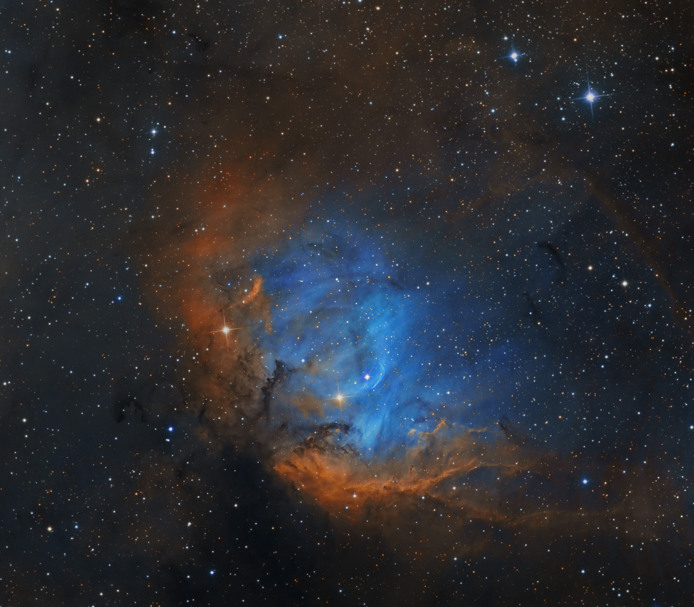 Framing a bright emission region this telescopic view looks out along the plane of our Milky Way Galaxy toward the nebula rich constellation Cygnus the Swan. Popularly called the Tulip Nebula, the glowing cloud of interstellar gas and dust is also found in the 1959 catalog by astronomer Stewart Sharpless as Sh2-101. About 8,000 light-years distant and 70 light-years across the complex and beautiful nebula blossoms at the center of the composite image. Red, green, and blue hues map emission from ionized sulfur, hydrogen, and oxygen atoms. Ultraviolet radiation from young, energetic stars at the edge of the Cygnus OB3 association, including O star HDE 227018, ionizes the atoms and powers the visible light emission from the Tulip Nebula. HDE 227018 is the bright star very near the blue arc at the center of the cosmic tulip.