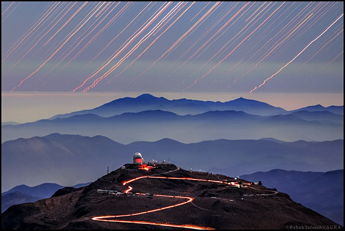 Early one moonlit evening car lights left a wandering trail along the road to the Chilean Cerro Tololo Inter-American Observatory. Setting stars left the wandering trails in the sky. The serene view toward the mountainous horizon was captured in a telephoto timelapse image and video taken from nearby Cerro Pachon, home to Gemini South. Afforded by the mountaintop vantage point, the clear, long sight-line passes through layers of atmosphere. The changing atmospheric refraction shifts and distorts the otherwise steady apparent paths of the stars as they set. That effect also causes the distorted appearance of Sun and Moon as they rise or set near a distant horizon.