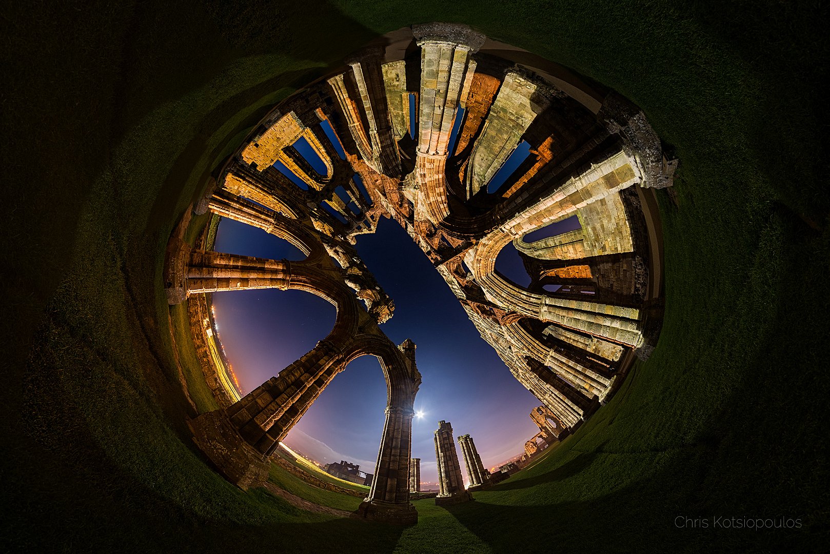 October's Hunters Moon shines near the horizon, setting beyond the arches of Whitby Abbey in this eerie night scene. The moonlight partly illuminates the ruined Benedictine abbey's grounds and walls on a cliff overlooking the North Sea from England's Yorkshire coast. Fans of Bram Stoker's 1897 novel Dracula will recognize the abbey and town of Whitby as the location of the Transylvanian count's shipwrecked landing on English shores. There fiction's most famous vampire transformed into an immense dog, jumped ashore and ran up the cliff to the ruined abbey. A 360 degree panorama, the dramatic fisheye view was created from 23 digitally stitched photos.