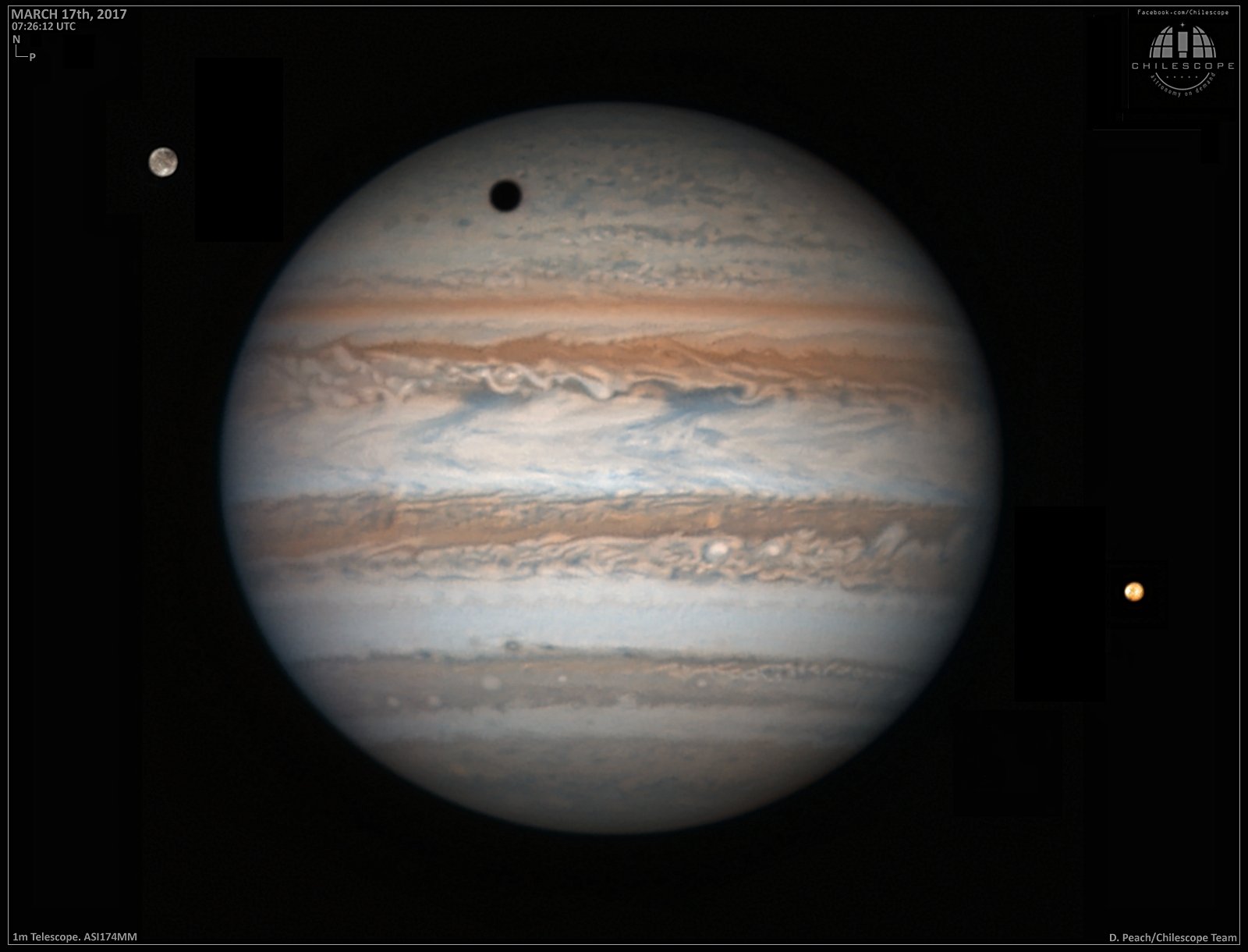 Approaching opposition early next month, Jupiter is offering some of its best telescopic views from planet Earth. On March 17, this impressively sharp image of the solar system's ruling gas giant was taken from a remote observatory in Chile. Bounded by planet girdling winds, familiar dark belts and light zones span the giant planet spotted with rotating oval storms. The solar system's largest moon Ganymede is above and left in the frame, its shadow seen in transit across the northern Jovian cloud tops. Ganymede itself is seen in remarkable detail along with bright surface features on fellow Galilean moon Io, right of Jupiter's looming disk.