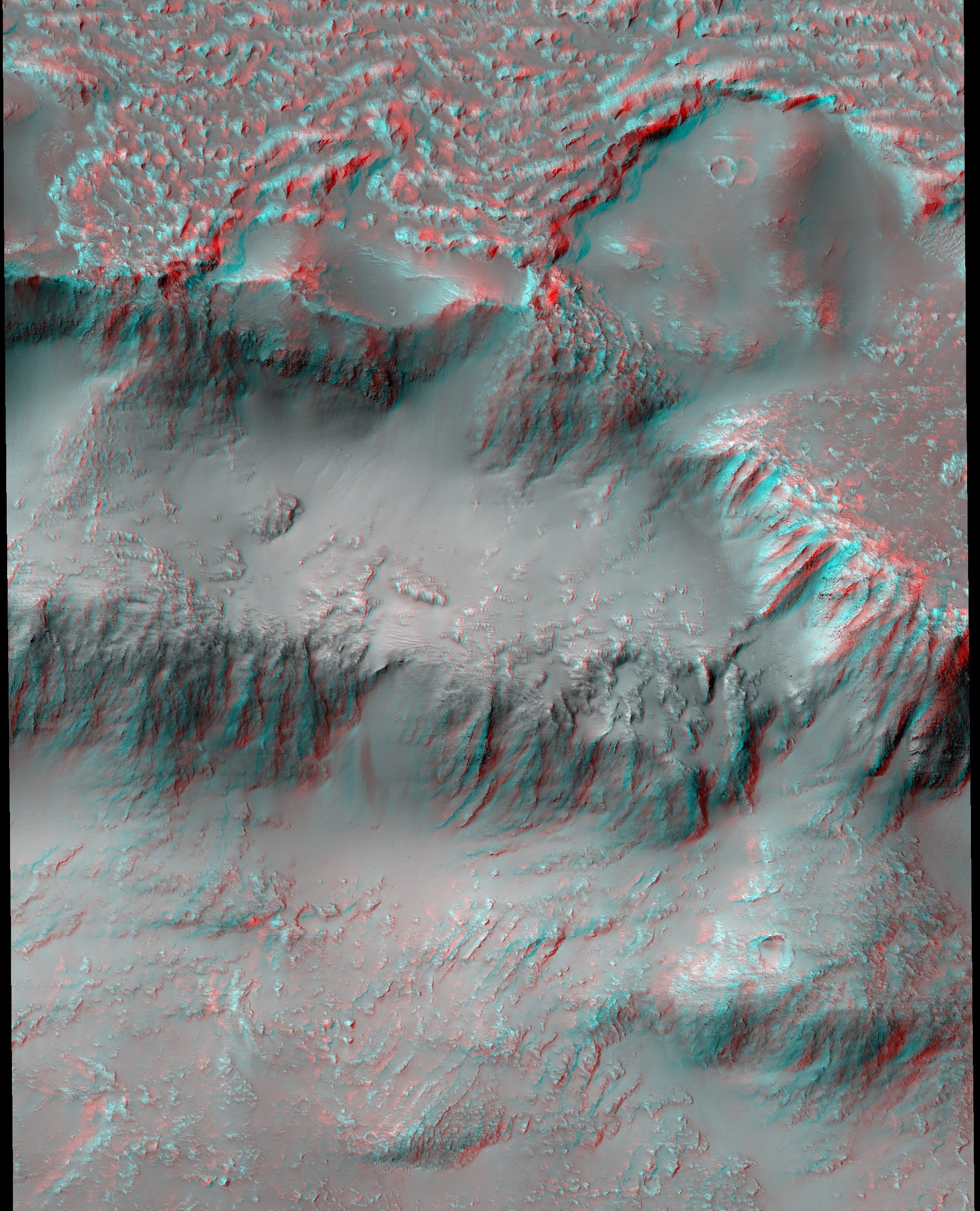Kırmızı/camgöbeği gözlüklerinizi takın ve Mars'ın lav şelalelerine doğru bakın. Bu stereo anaglif, Mars Reconnaissance Orbiter üzerindeki HiRISE kamerasının kaydettiği iki görüntünün birleştirilmesiyle oluşturuldu. Çok kademeli şelaleler, Kızıl Gezegen'in volkanik Tharsis bölgesinin batısında yer alan, çapı 48 kilometre olan bir Mars kraterinin kuzey kenarındaki bazı bölümlerin akan lav tarafından aşılmasıyla meydana geldi. Erimiş lav krater duvarından ve taraçalardan aşağı akıp krater tabanına ulaşırken, daha dik yamaçlarda belirgin biçimde pürüzlü, yelpaze biçimli akış izleri bıraktı. Kuzey üstte; nefes kesen 3B görünümün genişliği 8 kilometre.