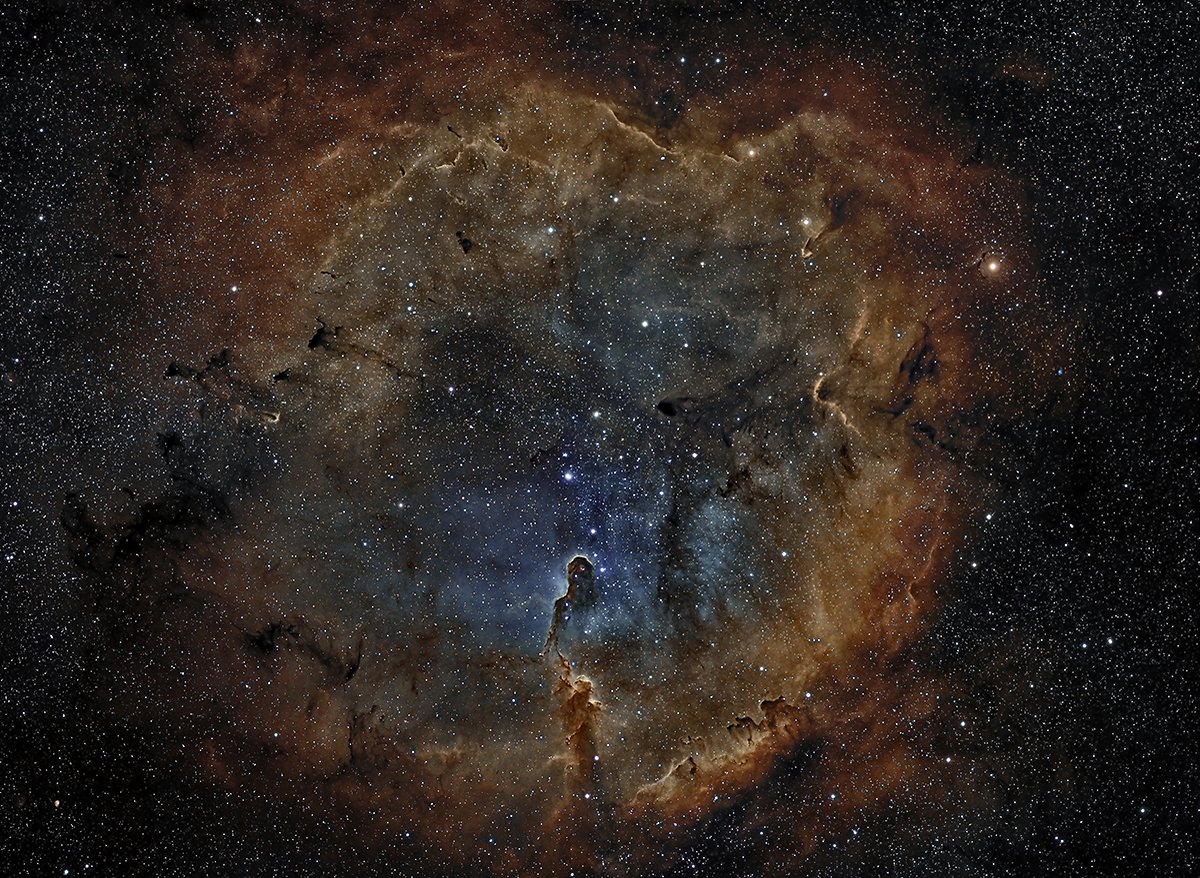 Stunning emission nebula IC 1396 mixes glowing cosmic gas and dark dust clouds in the high and far off constellation of Cepheus. Energized by the bright central star seen here, this star forming region sprawls across hundreds of light-years, spanning over three degrees on the sky while nearly 3,000 light-years from planet Earth. Among the intriguing dark shapes within IC 1396, the winding Elephant's Trunk nebula lies just below center. Stars could still be forming inside the dark shapes by gravitational collapse. But as the denser clouds are eroded away by powerful stellar winds and radiation, any forming stars will ultimately be cutoff from the reservoir of star stuff. The gorgeous color view is a composition of image data from narrowband filters, mapping emission from the nebula's atomic oxygen, hydrogen, and sulfur into blue, green, and red hues.