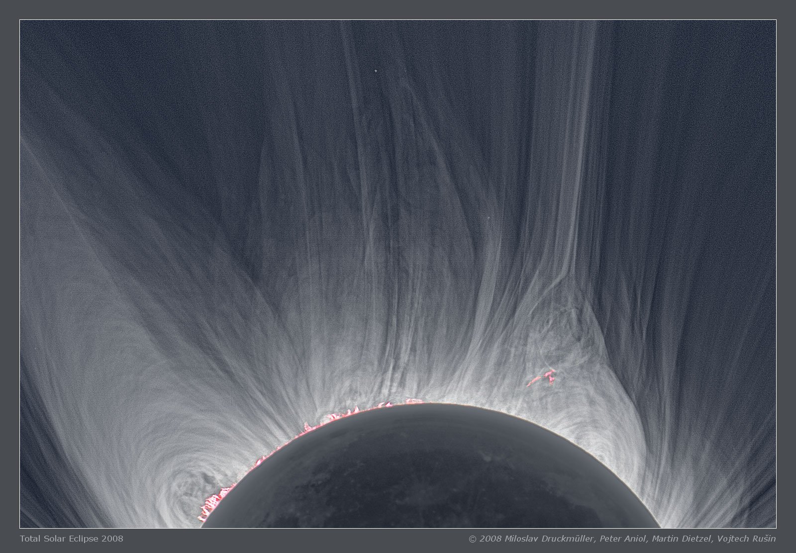 Bu tam Güneş tutulması görüntüsünde kararmış gökyüzü; parlak Venüs gezegenini, siluet hâlindeki Yeni Ay'ı ve Güneş'in titreşir gibi görünen koronasıyla birlikte barındırıyor. Eşzamanlı çekilmiş telefoto ve geniş açı karelerin birleştirilmesiyle oluşturulan bu bileşik görüntü, tam tutulma hattı üzerinde 18 yıl önce çekildi: 11 Ağustos 1999'da, Türkiye'de Kastamonu yakınlarında. Bu özel Güneş tutulması, Saros 145'in bir üyesi. Ay'ın yörüngesine ilişkin gözlemlerden tarihsel olarak bilinen Saros döngüsü, Güneş, Dünya ve Ay'ın bir Güneş (ya da Ay) tutulması için aynı geometrik dizilime ne zaman yeniden döneceğini öngörür. Saros'un periyodu 18 yıl, 11 ve 1/3 gündür. Bir Saros periyodu kadar arayla gerçekleşen tutulmalar, aynı numaralı Saros dizisine aittir ve birbirlerine çok benzer. Ancak aynı Saros içindeki ardışık Güneş tutulmalarının tam tutulma hattı, döngünün kesirli gün kısmı yüzünden Dünya üzerinde yer değiştirir. Çünkü Dünya, bu süre içinde fazladan 8 saat daha döner. Bu nedenle Saros 145'in bir sonraki Güneş tutulması da tam tutulma olacak; dar tam tutulma hattı ise 21 Ağustos 2017'de Amerika Birleşik Devletleri'ni bir kıyıdan öbür kıyıya kat edecek.