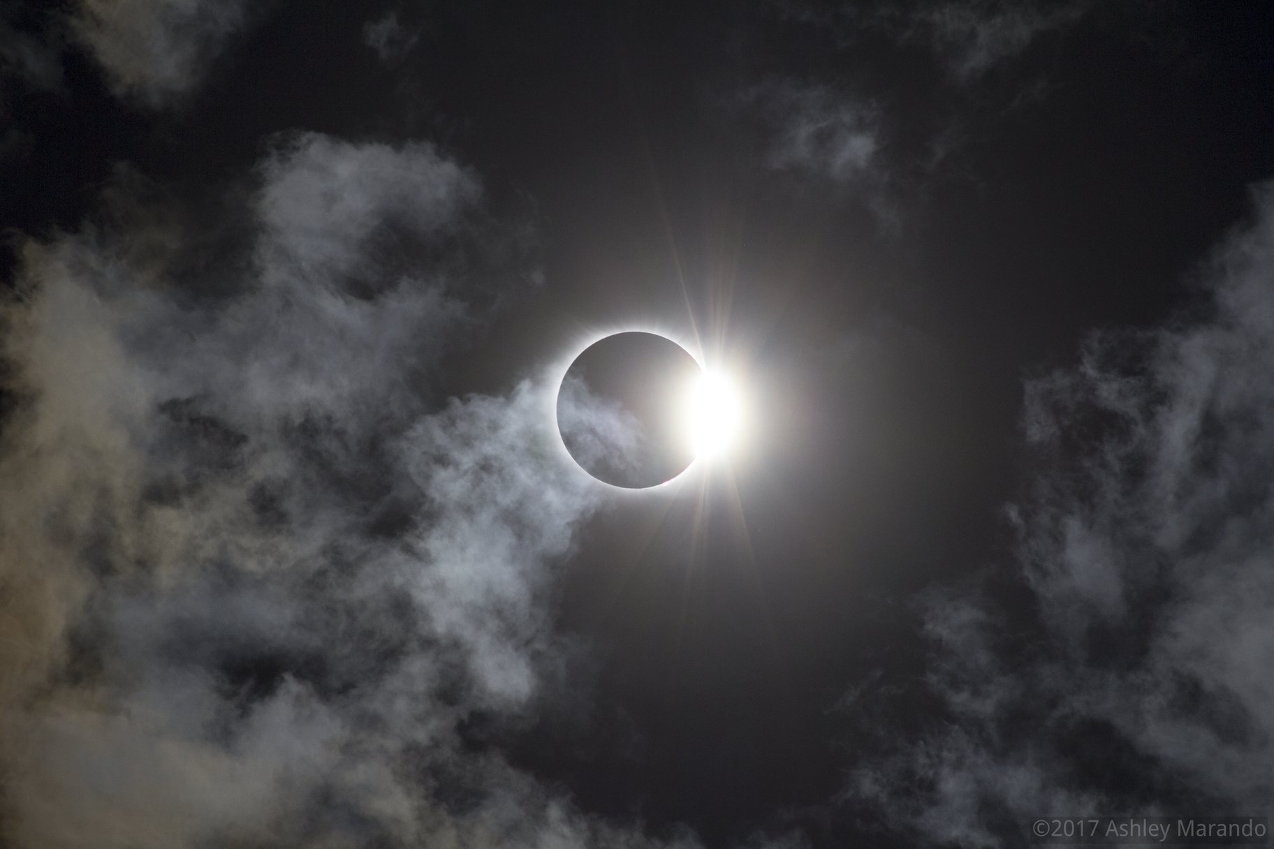 As the Moon's shadow swept across the US on August 21, eclipse chasers in the narrow path of totality were treated to a diamond ring in the sky. At the beginning and end of totality, the fleeting and beautiful effect often produces audible gasps from an amazed audience. It occurs just before or after the appearance of the faint solar corona with a brief ring of light and glimpse of Sun. In this scene from the end of totality at Central, South Carolina, clouds drift near the Sun's diamond ring in the sky.