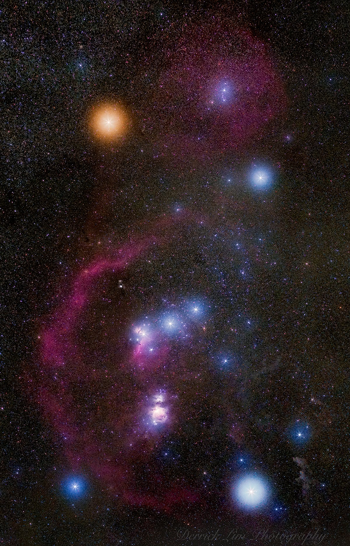 Do you recognize this constellation? Although it is one of the most recognizable star groupings on the sky, Orion's icons don't look quite as colorful to the eye as they do to a camera. In this 20-image digitally-composed mosaic, cool red giant Betelgeuse takes on a strong orange tint as the brightest star at the upper left. Orion's hot blue stars are numerous, with supergiant Rigel balancing Betelgeuse at the lower right, and Bellatrix at the upper right Lined up in Orion's belt are three stars all about 1,500 light-years away, born from the constellation's well-studied interstellar clouds. Below Orion's belt a reddish and fuzzy patch that might also look familiar -- the stellar nursery known as Orion's Nebula. Finally, just barely visible to the unaided eye but quite striking here by camera is Barnard's Loop -- a huge gaseous emission nebula surrounding Orion's Belt and Nebula discovered over 100 years ago by the pioneering Orion photographer E. E. Barnard.