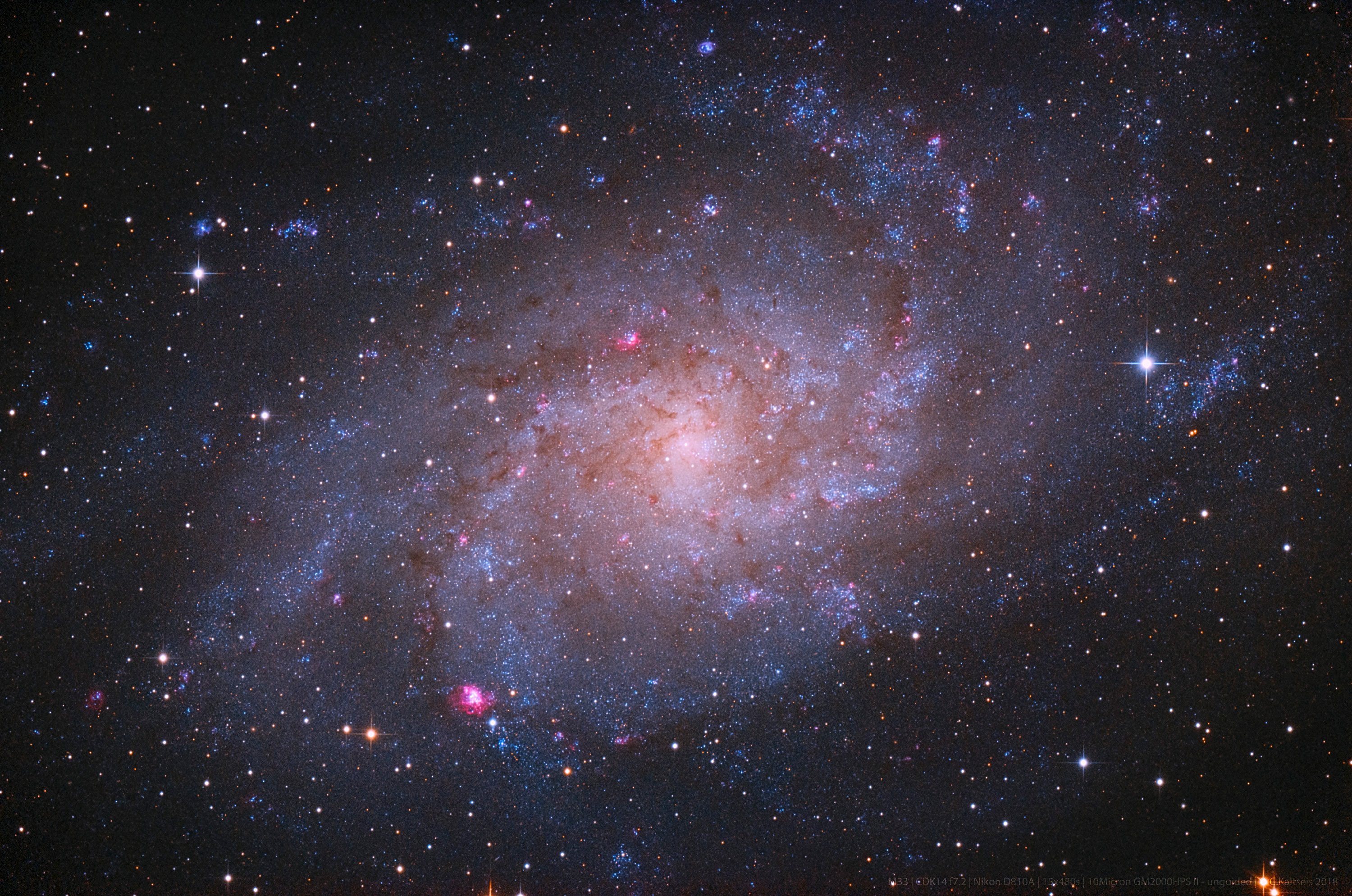 The small, northern constellation Triangulum harbors this magnificent face-on spiral galaxy, M33. Its popular names include the Pinwheel Galaxy or just the Triangulum Galaxy. M33 is over 50,000 light-years in diameter, third largest in the Local Group of galaxies after the Andromeda Galaxy (M31), and our own Milky Way. About 3 million light-years from the Milky Way, M33 is itself thought to be a satellite of the Andromeda Galaxy and astronomers in these two galaxies would likely have spectacular views of each other's grand spiral star systems. As for the view from planet Earth, this sharp image shows off M33's blue star clusters and pinkish star forming regions along the galaxy's loosely wound spiral arms. In fact, the cavernous NGC 604 is the brightest star forming region, seen here at about the 7 o'clock position from the galaxy center. Like M31, M33's population of well-measured variable stars have helped make this nearby spiral a cosmic yardstick for establishing the distance scale of the Universe.