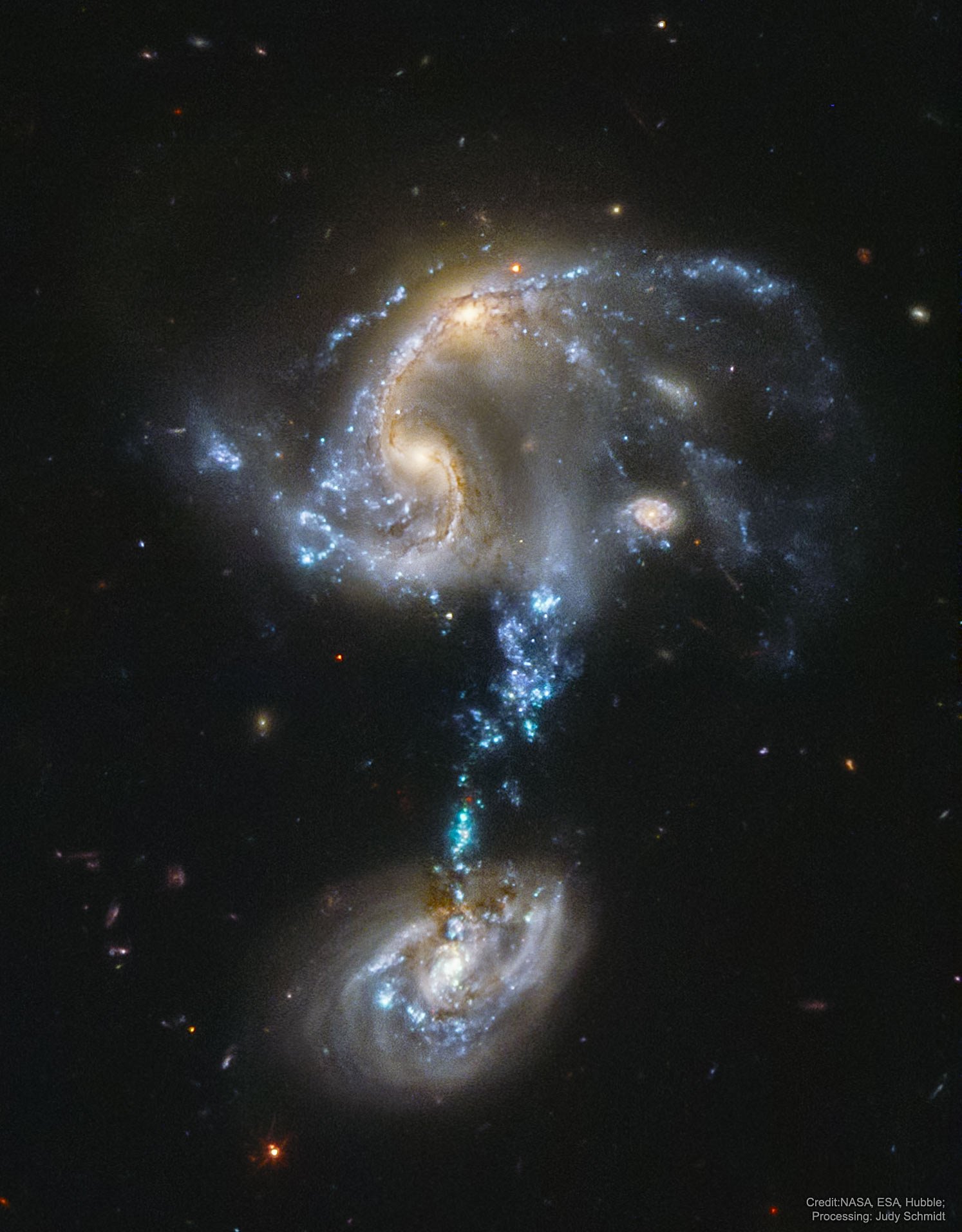 Why are stars forming in the bridge between these colliding galaxies? Usually when galaxies crash, star formation is confined to galaxy disks or tidal tails. In Arp 194, though, there are bright knots of young stars right in a connecting bridge. Analyses of images and data including the featured image of Arp 194 from Hubble, as well as computer simulations of the interaction, indicate that the bottom galaxy passed right through the top galaxy within the past 100 million years. The result has left a stream of gas that is now falling toward the bottom galaxy. Astronomers hypothesize that stars form in this bridge because of the recent fading of turbulence after the rapid collision. In about a billion years, the galaxies -- including a smaller galaxy superposed on the upper galaxy (see it?) -- will all merge into one larger galaxy.