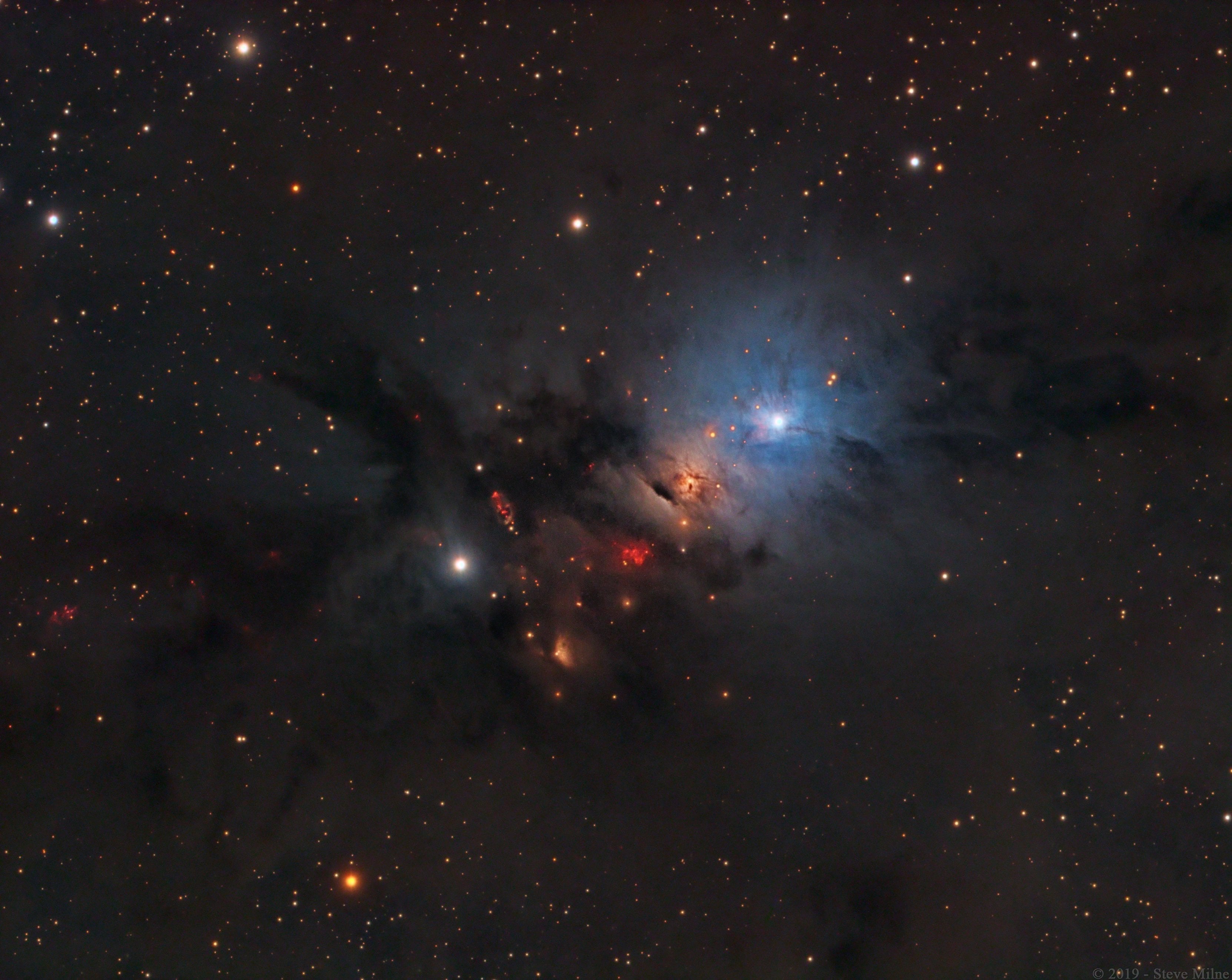 NGC 1333 is seen in visible light as a reflection nebula, dominated by bluish hues characteristic of starlight reflected by interstellar dust. A mere 1,000 light-years distant toward the heroic constellation Perseus, it lies at the edge of a large, star-forming molecular cloud. This striking close-up spans about two full moons on the sky or just over 15 light-years at the estimated distance of NGC 1333. It shows details of the dusty region along with telltale hints of contrasty red emission from Herbig-Haro objects, jets and shocked glowing gas emanating from recently formed stars. In fact, NGC 1333 contains hundreds of stars less than a million years old, most still hidden from optical telescopes by the pervasive stardust. The chaotic environment may be similar to one in which our own Sun formed over 4.5 billion years ago.