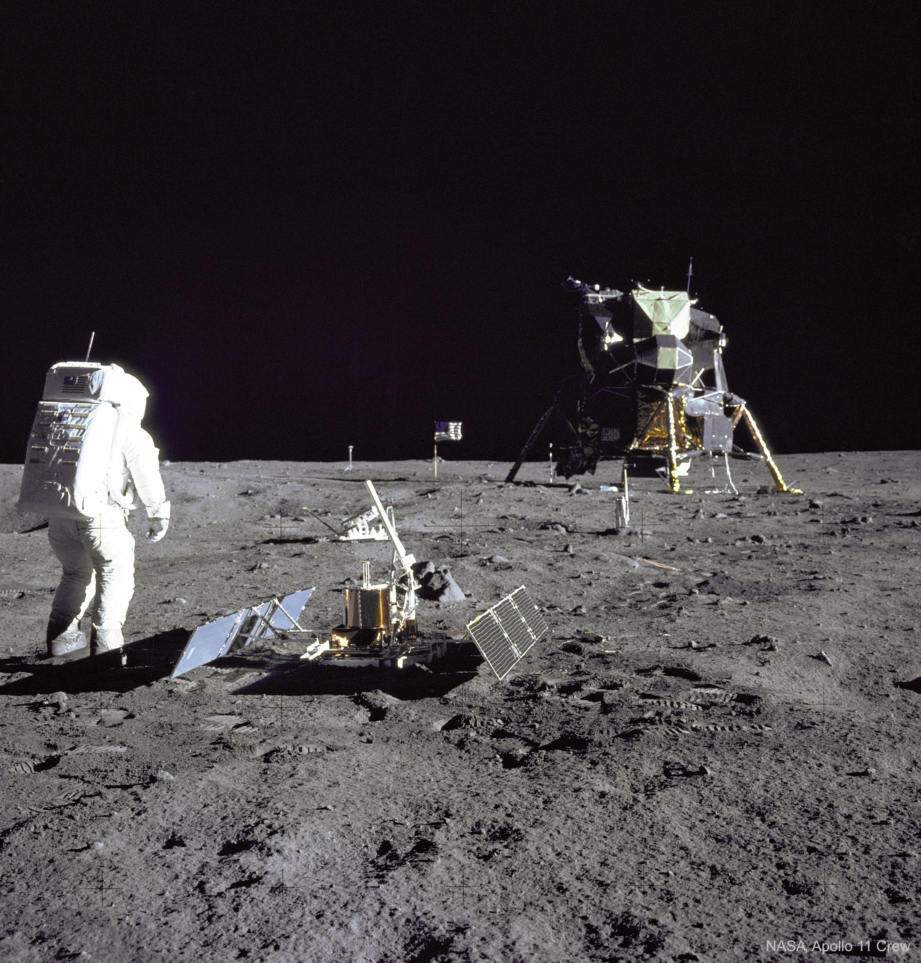 Have you seen a panorama from another world lately? Assembled from high-resolution scans of the original film frames, this one sweeps across the magnificent desolation of the Apollo 11 landing site on the Moon's Sea of Tranquility. The images were taken by Neil Armstrong looking out his window of the Eagle Lunar Module fifty years ago, shortly after the July 20, 1969 landing. The frame at the far left (AS11-37-5449) is the first picture taken by a person on another world. Toward the south, thruster nozzles can be seen in the foreground on the left, while at the right, the shadow of the Eagle is visible to the west. For scale, the large, shallow crater on the right has a diameter of about 12 meters. Frames taken from the Lunar Module windows about an hour and a half after landing, before walking on the lunar surface, were intended to initially document the landing site in case an early departure was necessary.