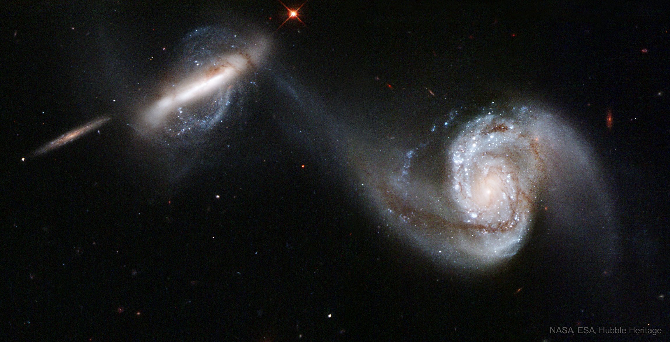 about 300 million light-years distant toward the constellation Leo. The prominent edge-on spiral galaxy at the far left appears to be a more distant background galaxy and not involved in the on-going merger.