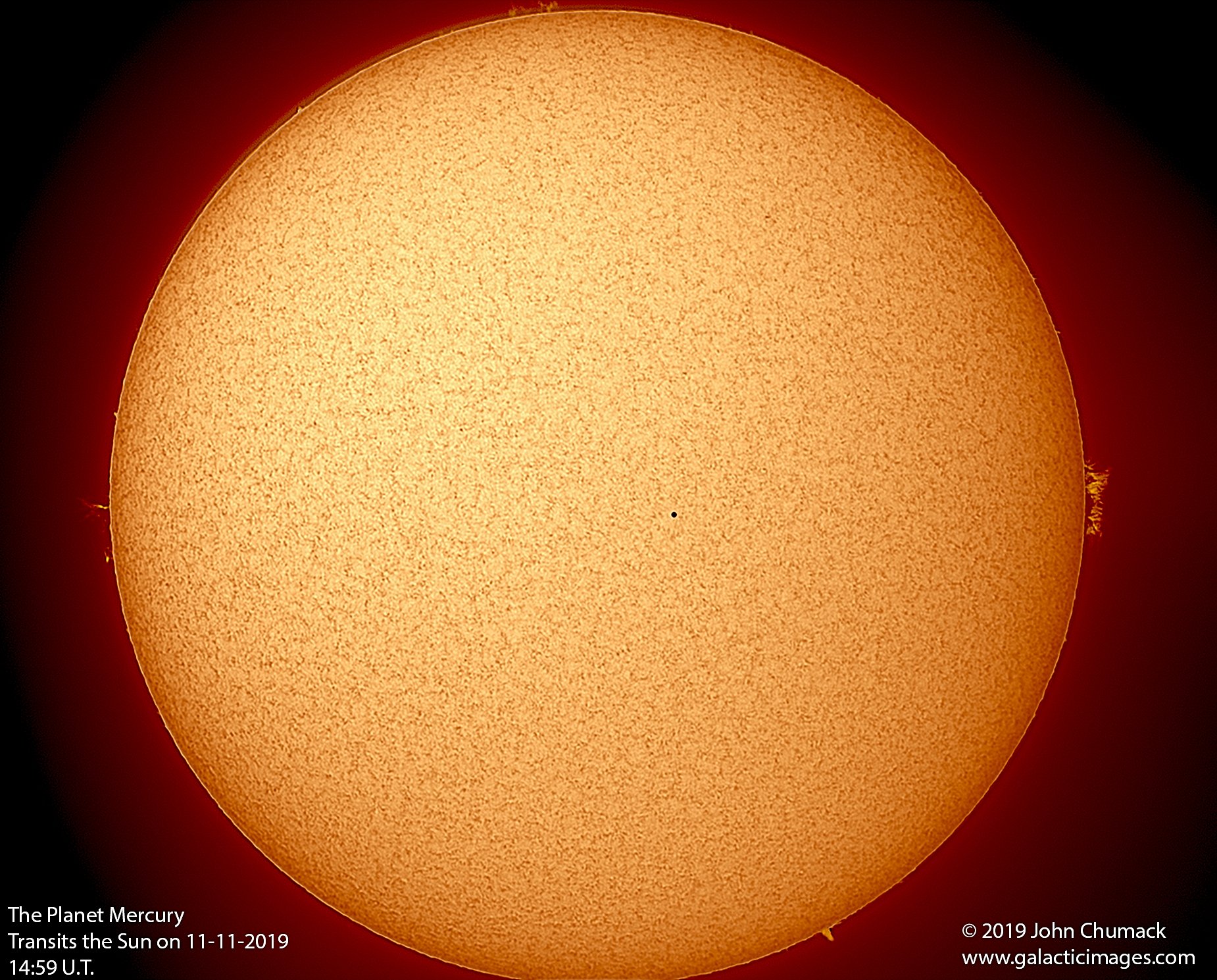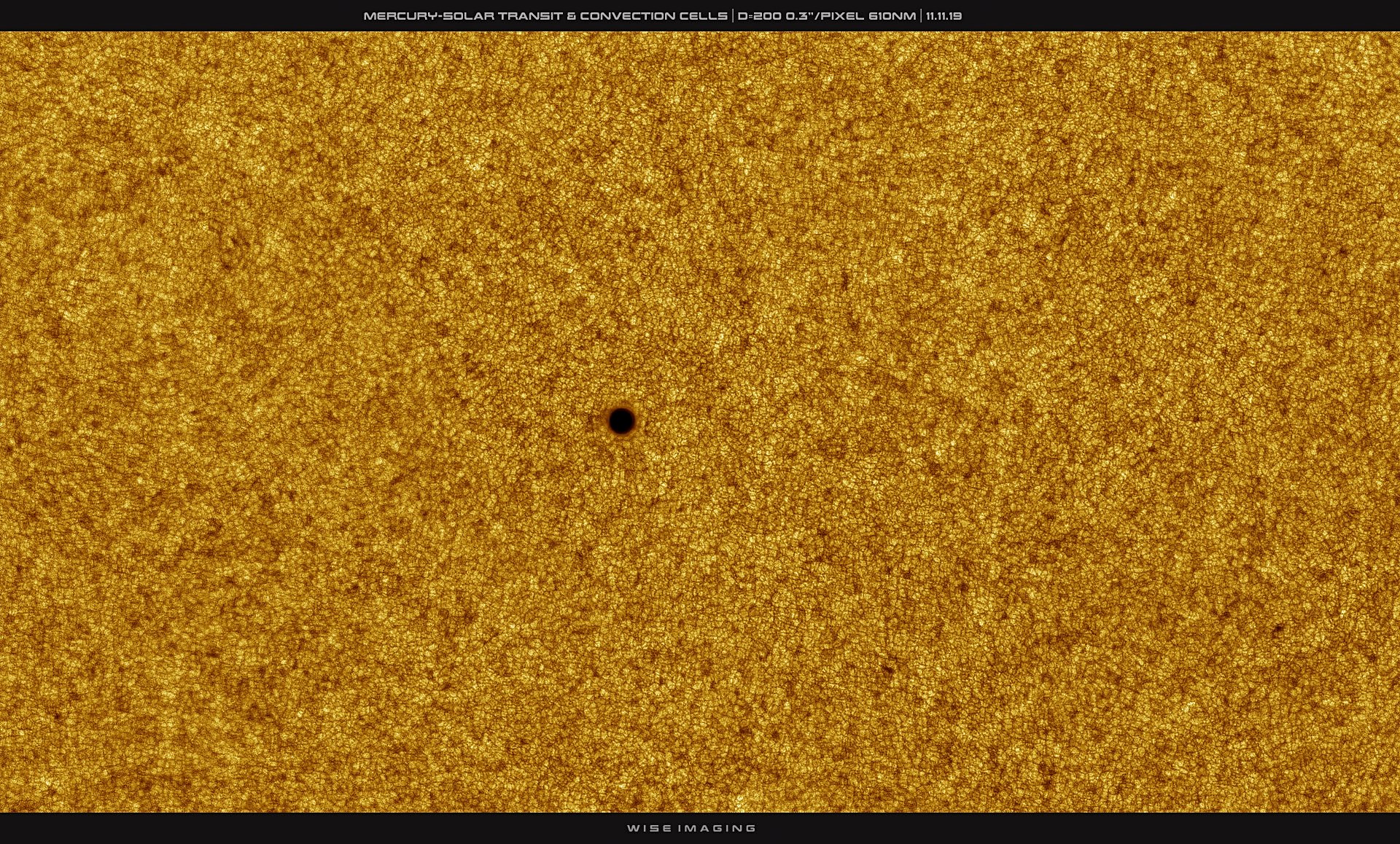 The small, dark, round spot in this solar close up is planet Mercury. In the high resolution telescopic image, a colorized stack of 61 sharp video frames, a turbulent array of photospheric convection cells tile the bright solar surface. Mercury's more regular silhouette still stands out though. Of course, only inner planets Mercury and Venus can transit the Sun to appear in silhouette when viewed from planet Earth. For this November 11, 2019 transit of Mercury, the innermost planet's silhouette was a mere 1/200th the solar diameter. So even under clear daytime skies it was difficult to see without the aid of a safe solar telescope. Following its transit in 2016, this was Mercury's 4th of 14 transits across the solar disk in the 21st century. The next transit of Mercury will be on November 13, 2032.