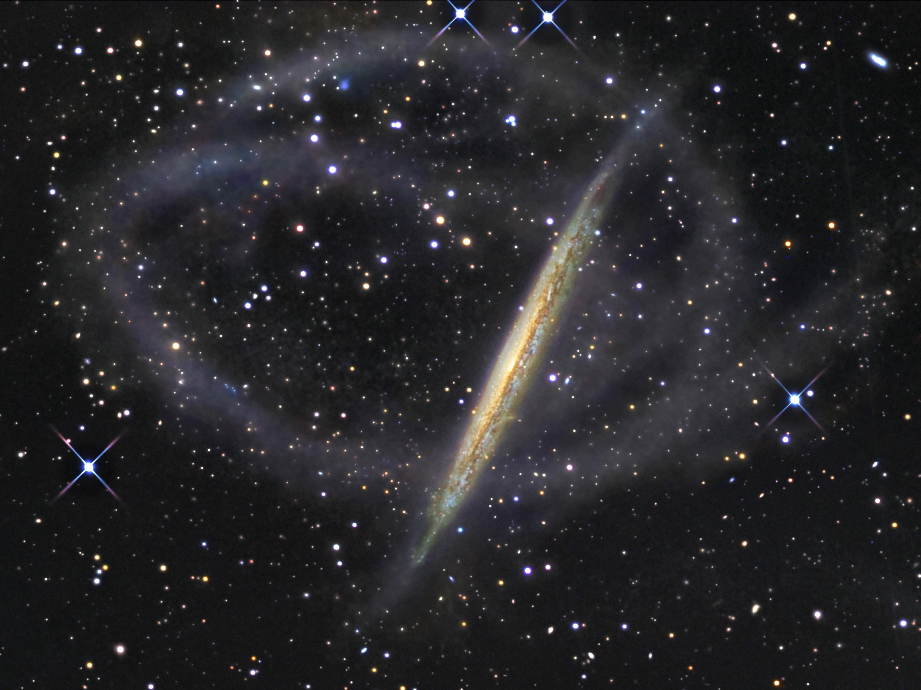 NGC 5907 galaksisini büyük yıldız gelgit akımları çevrelemiş gibi görünüyor. Kıymık veya Bıçak Kenarı Galaksisi olarak da bilinen bu dar ve uzun yapıdaki sarmal galaksi, 150.000 ışık yılı boyunca uzanan kavisli yapılar ve sarmal yapısından uzanan ince halkalardan oluşuyor.  Yalnızca çok derin pozlamalar ile kaydedilen akışlar muhtemelen bir cüce galaksinin hayaletimsi izini (daha küçük bir uydu galaksinin yörüngesi boyunca kalan ve yavaş yavaş parçalanan ve dört milyar yıl önce NGC 5907 ile birleşen bir enkaz) temsil ediyor. Nihayetinde, New Mexico'daki küçük bir robotik gözlemevinden alınan bu olağanüstü keşif görüntüsü, Samanyolu Galaksi'miz de dahil olmak üzere büyük sarmal galaksilerin daha küçük olanların birikimiyle oluştuğu kozmik senaryoyu desteklemektedir. NGC 5907, kuzey takımyıldızı Draco'da yaklaşık 40 milyon ışık yılı uzaklıkta yer almaktadır.