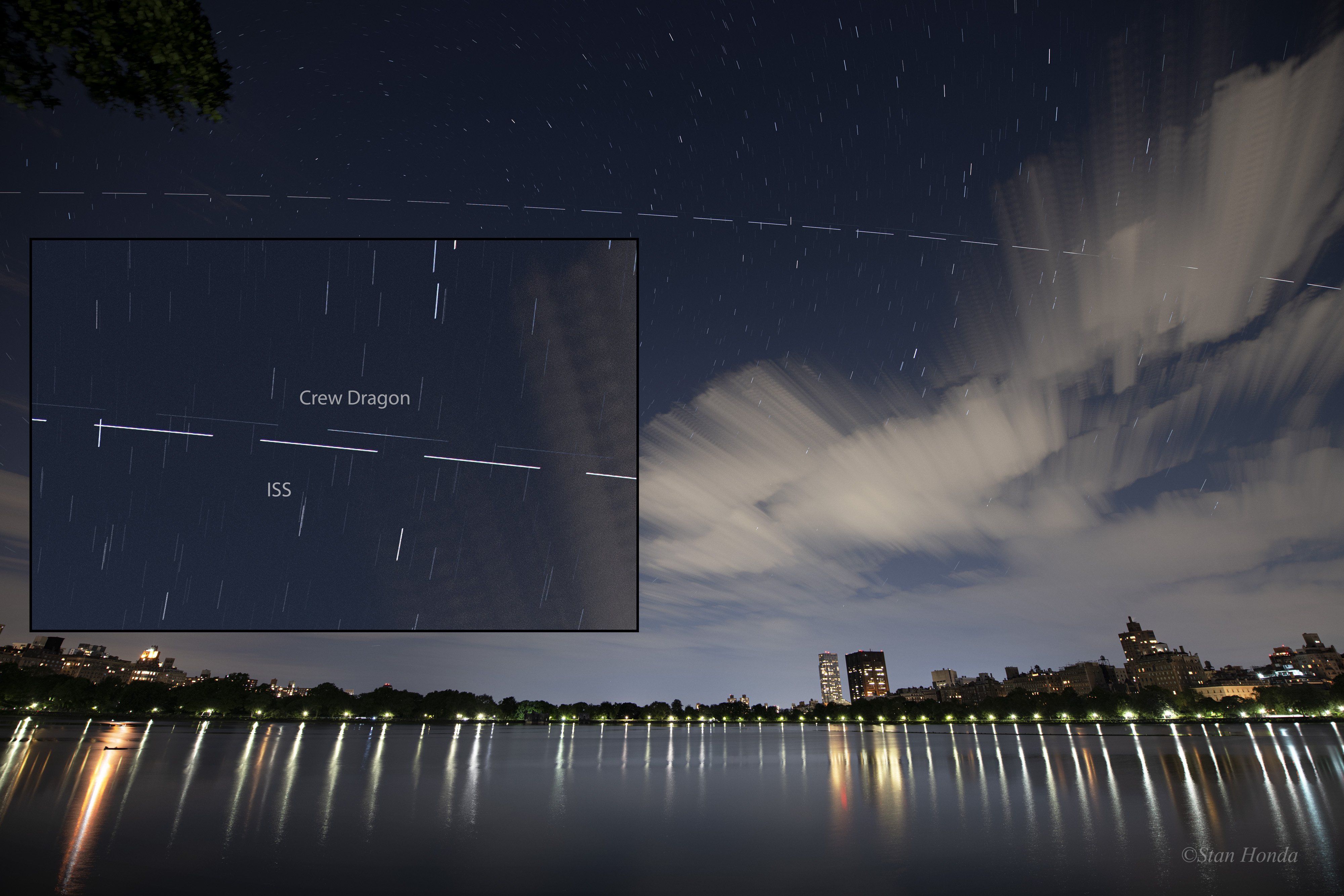 Güneş ışığıyla duş alan Uluslararası Uzay İstasyonu, akşam saatlerinde Manhattan’ın gökyüzünden geçti. Soldan sağa doğru hareket ederken bıraktığı bu parlak iz, 5 saniyelik pozlamalarla çekilmiş fotoğrafların birleştirilmesiyle oluşturuldu. Yıldızlar daha kısa izler bırakıyor, Central Park’ta kuzeye bakan bölgedeki sudan da ışıklar yansıyor. Alçak Dünya yörüngesindeki Uluslararası Uzay İstasyonu’nu kovalamakta olan Endeavour isimli Crew Dragon (Ejderha) uzay aracı da şehir ışıklarının arasına bir iz bıraktı. Fırlatmadan yaklaşık 6 saat sonra, uzay aracının soluk izi, görseldeki bulunan kutucuğun içerisinde de görülebileceği gibi, sağdaki bulutların kıyısına yaklaşırken UUİ’nin üzerinde beliriyor. Dragon Endeavor, yörüngeye oturduktan yaklaşık 9 saat sonra, Uluslararası Uzay İstasyonu’na başarılı şekilde kenetlendi.