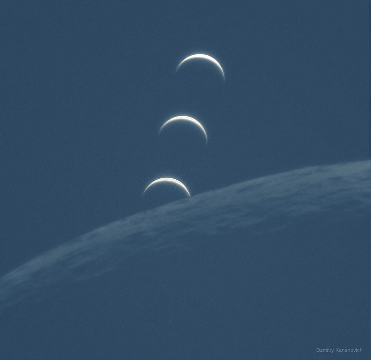 Bu görüntü, Dünya’nın doğuşu gibi görünüyor olabilir. Ancak aslında, Venüs’ün batışı. İki gün önce, Güneş doğduktan hemen sonra, hem Ay hem de Venüs doğdu. Lakin sonra Ay, Venüs’ü geçti. Paylaşılan bu Ay merkezli görüntüler serisinde Venüs, gitgide Ay’a yaklaşmakta. 50 yıl önce çekilen meşhur Dünya’nın doğuşu fotoğrafı; Ay’ın yörüngesindeki Apollo 8 mürettebatı tarafından Dünya, Ay’ın kenarından doğmaktayken yakalanmıştı. Bu Venüs batışı fotoğrafı da benzer şekilde Dünya’dan, daha doğrusu Estonya’dan çekildi. Venüs yalnızca ince bir hilal şeklinde görünüyor çünkü geçtiğimiz hafta, Dünya’dan göründüğü kadarıyla neredeyse Güneş’in önünden geçti. Ay da benzer şekilde yalnızca ince bir hilal şeklinde çünkü Ay, yakında Dünya’ya göre doğrudan olarak Güneş’in önünden geçecek. Hatta bugün yani fotoğraf çekildikten iki gün sonra, Ay bir Güneş tutulması oluşturdu ve Dünya üzerinde ufak bir bölge, halkalı Güneş tutulmasına tanıklık etti.
