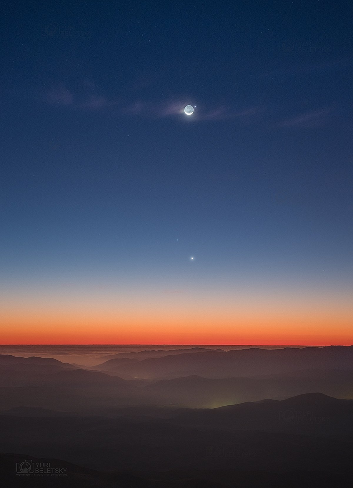 Burada kaç tane uydu görüyorsunuz? Birçok insan sol alttaki Dünya’nın uydusuna atıfta bulunarak bir tane diyecektir. Ancak sağ üstteki objeye daha yakından bakın. Bu yıldız gibi görünen aslında Jüpiter gezegenidir. Daha yakından baktığınızda en büyük uyduları ile çevrili olduğunu ve yalnız olmadığını fark edebilirsiniz. Bu Galileo Uyduları soldan sağa Io, Ganymede, Europa ve Callisto‘dur ve tıpkı Güneş Sistemi’mizdeki gezegenlerin Güneş’in etrafında döndüğü gibi, Jüpiter’in etrafında dönerler. Yandan bakıldığında bir çizgi üzerindeler. Paylaşılan bu tek kare fotoğraf, geçtiğimiz hafta Meksika Cancun’dan çekildi. Luna (Ay), Dünya etrafındaki yörüngesinde dönerken uzaktaki gezegenin yanından süzülerek geçtiği sırada kaydedildi. Şu anda NASA’nın Juno uzay aracı tarafından Jüpiter’in daha da iyi görüntüleri çekiliyor. Juno şu anda, Güneş Sistemi’nin en büyük gezegeni etrafında döngüsel bir yörüngede. Dünya’nın uydusu, ayda (Ay) bir kez Jüpiter ve Satürn’ün neredeyse önünden geçmeye devam edecek. Bu iki dev gezegen Aralık ayında kendi büyük yakınlaşmalarını gerçekleştirecek.