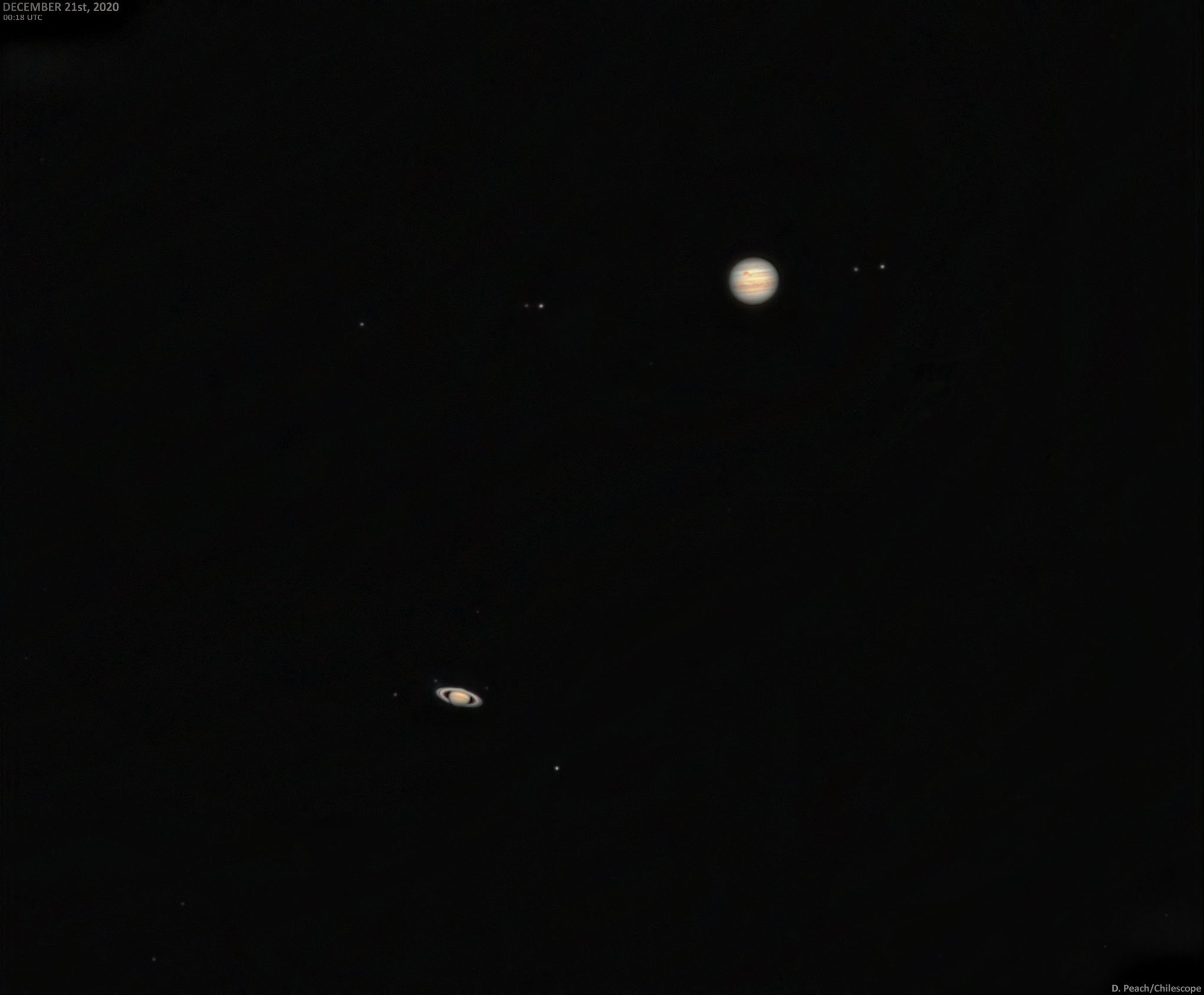 Satürn ve Jüpiter giderek yaklaşıyor ve yakında neredeyse aynı yönde görünecekler. Tesadüfi olarak, Aralık gündönümünün gecesinde uzun süredir beklenen Büyük Kavuşum gerçekleşecek. Kuzey yarım kürede yılın en uzun gecesi ve güney yarım kürede en uzun günün olduğu tarihte. Bundan yaklaşık altı gün sonra, Satürn ve Jüpiter her 20 yılda bir görüldüğü gibi yan yana olacaklar. Ancak bu yakınlaşma herhangi bir Büyük Kavuşum değil, 1623’ten beri gerçekleşecek en yakın kavuşum olacak. İki dev gezegenin arasındaki mesafe sadece, yaklaşık bir derecenin 1/10’u kadar olacak. Yani dolunayın görünür yarıçapından çok daha az. Önümüzdeki birkaç gün içinde hilal evresindeki Ay, yakınlaşan gezegenlerden birkaç derece uzaklıktan geçecek ve ikonik fotoğraflar için bir ön fırsat verecek. Bu illüstrasyon, Kasım ve Aralık ayları boyunca Fransa Alpleri üzerindeki Satürn ve Jüpiter‘in gitgide yaklaşmasını gösteriyor.