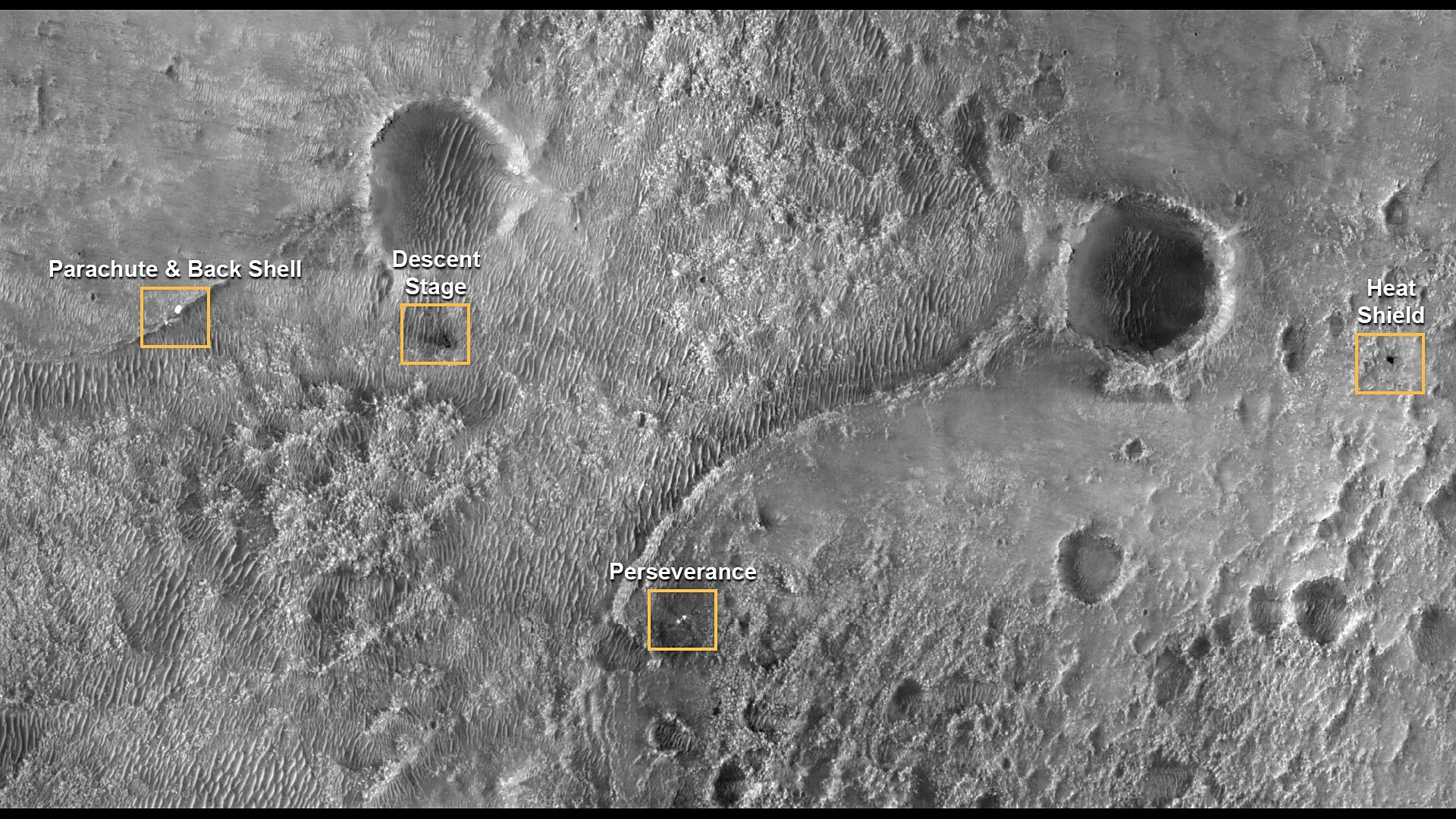 Mars yüzeyine ulaştıktan bir gün sonra Perseverance iniş bölgesi, yörüngedeki Mars Keşif Gezgini tarafından alınan bu yüksek çözünürlüklü görselde belirlendi. Gezginin keşif kamerasından alınan görüntü aynı zamanda, Mars 2020 görevinin iniş aşamasının, ısı kalkanının, paraşütün ve arka kabuğunun konumunu da gösteriyor. Bütün bunlar Perseverance (Azim) gezgininin Mars yüzeyine inmesini sağlamıştı. Açıklamalı bir şekilde görülen her kutu, Jezero Krateri’nin zeminde 200 metre (650 fit) genişliğinde yer kaplar. Perseverance, iniş aşaması yüzeye indirilirken roket egzozu tarafından oluşturulan desenin merkezinde yer alıyor. Gökyüzü vincinin manevrasının ardından, iniş aşaması gezginden güvenli bir mesafeye kadar uçtu. En son dinlenme yeri ise koyu V şeklindeki moloz deseniyle görülmekte. İniş sırasında ayrıldıktan sonra yüzeye düşen ısı kalkanı, paraşüt ve arka kabuğun bulundukları konum, Mars yörüngesindeki gezginden alınan bu yüksek çözünürlüklü görselde belirtilmiştir.