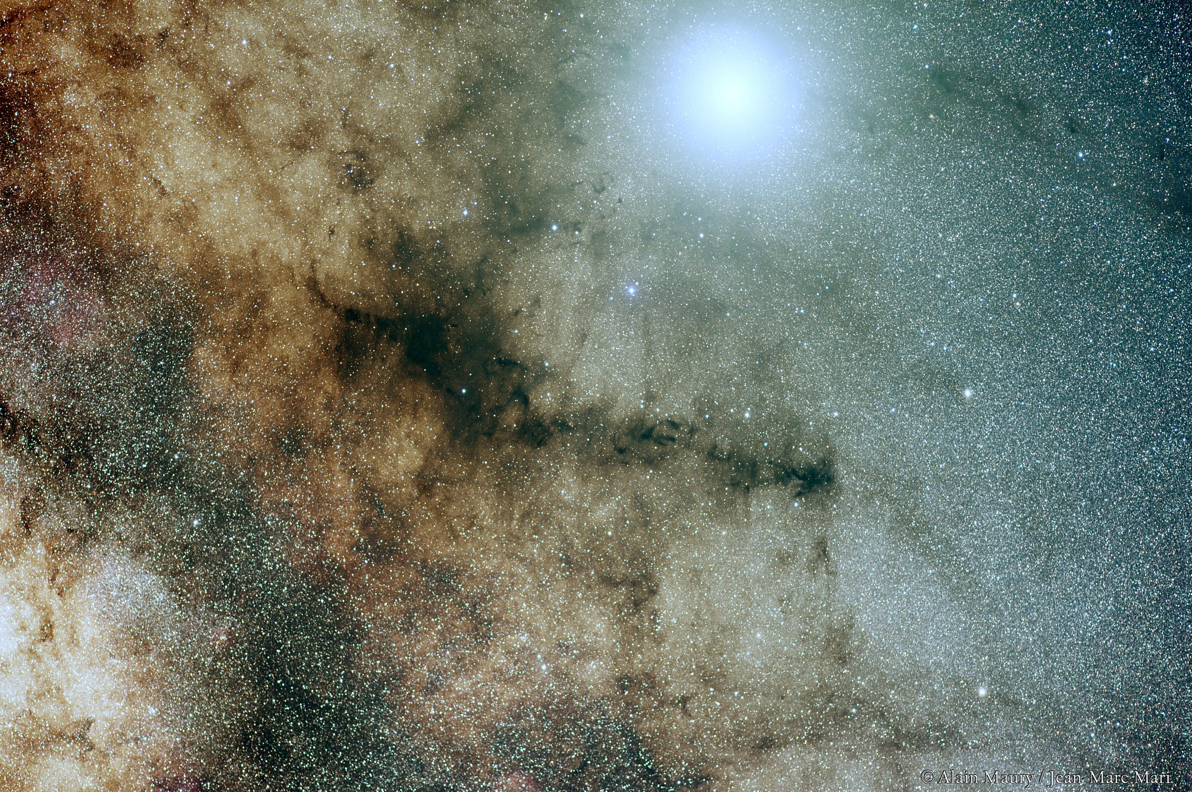 Atın kafasını görüyor musunuz? Gördüğünüz, Avcı yönündeki ünlü Atbaşı bulutsusu değil, derin görüntüleme ile tanıdık bir biçim alan sönük bir bulutsudur. Burada görülebilen moleküler bulut sisteminin ana kısmı, IC 4592 olarak kataloglanmış bir yansıma bulutsusudur. Yansıma bulutsuları normalde karanlık görünen ancak yakınlardaki yüksek enerjili yıldızların görünür ışığını yansıtırken oldukça mavi görünebilen çok ince tozdan oluşur. Bu durumda, yansıyan ışığın çoğunun kaynağı, atın gözündeki bir yıldızdır. Bu yıldız, Akrep (Scorpius) takımyıldızı yönündeki parlak yıldız sistemlerinden biri olan Nu Scorpii’nin bir parçasıdır. Görüntü merkezinin sağ tarafında, iki yıldızı çevreleyen IC 4601 adlı ikinci bir yansıma bulutsusu görülebilir.