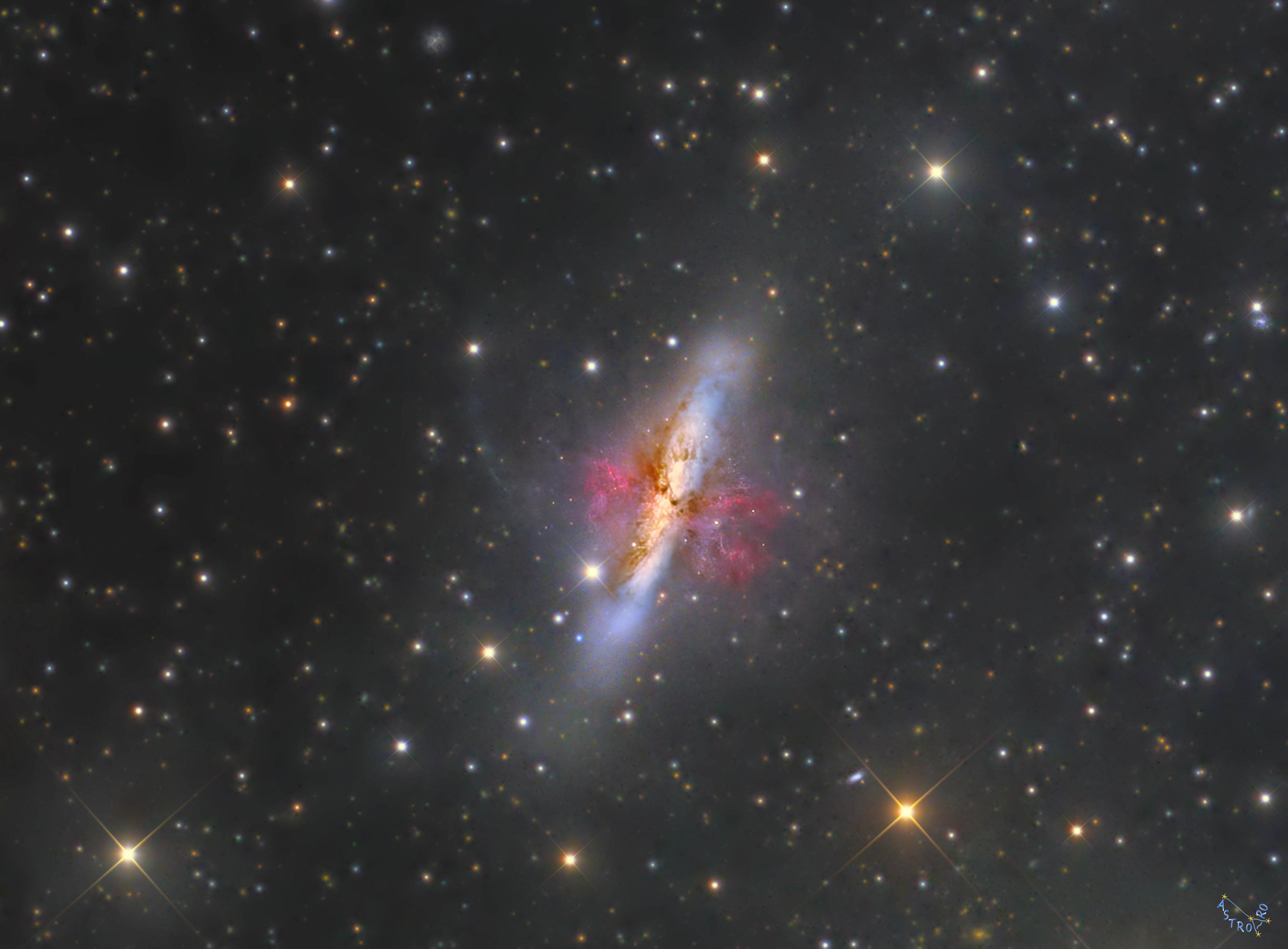 M82 süper rüzgarlı bir yıldız yağmuru galaksisidir. Art arda gelen süpernova patlamaları ve devasa yıldızlardan gelen güçlü rüzgarlar sayesinde, M82’de yıldız oluşumu sırasında gerçekleşen patlama olağanüstü bir çıkışa yol açıyor. Galaksinin merkez bölgelerinden gelen süper rüzgarların kanıtı, bu keskin teleskop görüntüsünde açıkça görülüyor. Birleşik görüntüdeki kırmızımsı tonlar, atomik haldeki hidrojen gazının yaydığı emisyonu vurgulamaktadır. Süper rüzgardaki gazın bir bölümü, devasa yıldızlarda oluşan ağır elementlerle zenginleştirilmiştir ve nihayetinde galaksilerarası uzaya karışacaktır. Yakındaki büyük galaksi M81 ile karşı karşıya gelmenin tetiklediği, M82’deki öfkeli yıldız oluşumu patlamasının yaklaşık 100 milyon yıl sürmesi gerekiyor. Uzatılmış biçimdeki görünümü nedeniyle, Puro Galaksisi olarak da bilinen M82, yaklaşık 30.000 ışık yılı genişliğindedir. 12 milyon ışık yılı uzaklıkta ve Büyükayı‘nın kuzey sınırına yakın bir yerde bulunur.