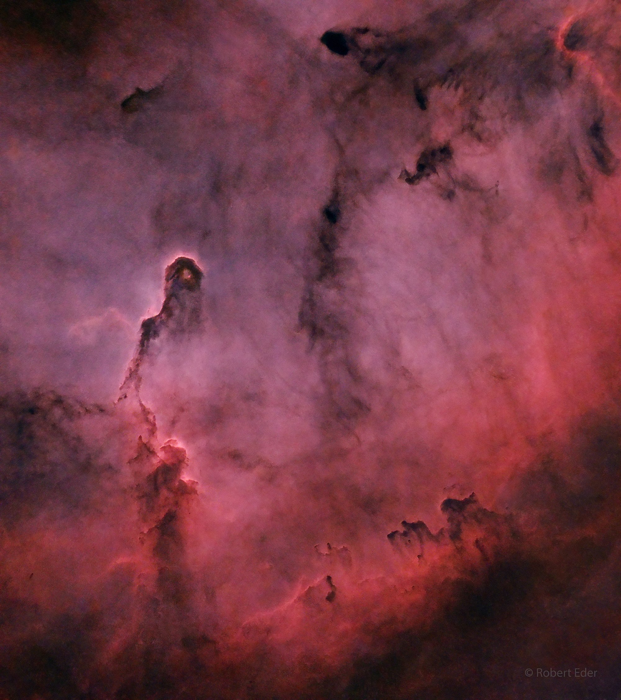 Just So Story‘deki bir illüstrasyon gibi, Fil Hortumu Bulutsusu, emisyon bulutsusu ve genç yıldız kümesi IC 1396 boyunca yayılmıştır. Kral takımyıldızının uzaklarında yer alır. Aynı zamanda vdB 142 olarak bilinen soldaki kozmik fil hortumu, yaklaşık 20 ışık yılından uzundur. Dijital görüntü işleme ile, bu ayrıntılı teleskop görüntüsündeki yıldızlar kaldırılmıştır. Soğuk yıldızlararası toz ve gazı vurgulayan görünür yıldızlar yoktur. Ancak karanlık, dal şeklindeki bulutlar yıldız oluşumu için gerekli olan hammaddeyi barındırır ve içlerinde ön yıldızları gizler. ​Yaklaşık 3000 ışık yılı uzaklıktaki, nispeten sönük olan IC 1396 kompleksi gökyüzünde büyük bir alana yayılmıştır, 5 dereceden fazla bir alanı kaplar. Bu yıldızsız görsel, 1 derecelik geniş bir görüş alanına yayılmış durumda. Yani yaklaşık 2 dolunayın açısal büyüklüğü kadar. Fil Hortumu’na doğru ilerleyen alttaki ve sağdaki karanlık şekiller, kimileri tarafından Karavan olarak bilinir.