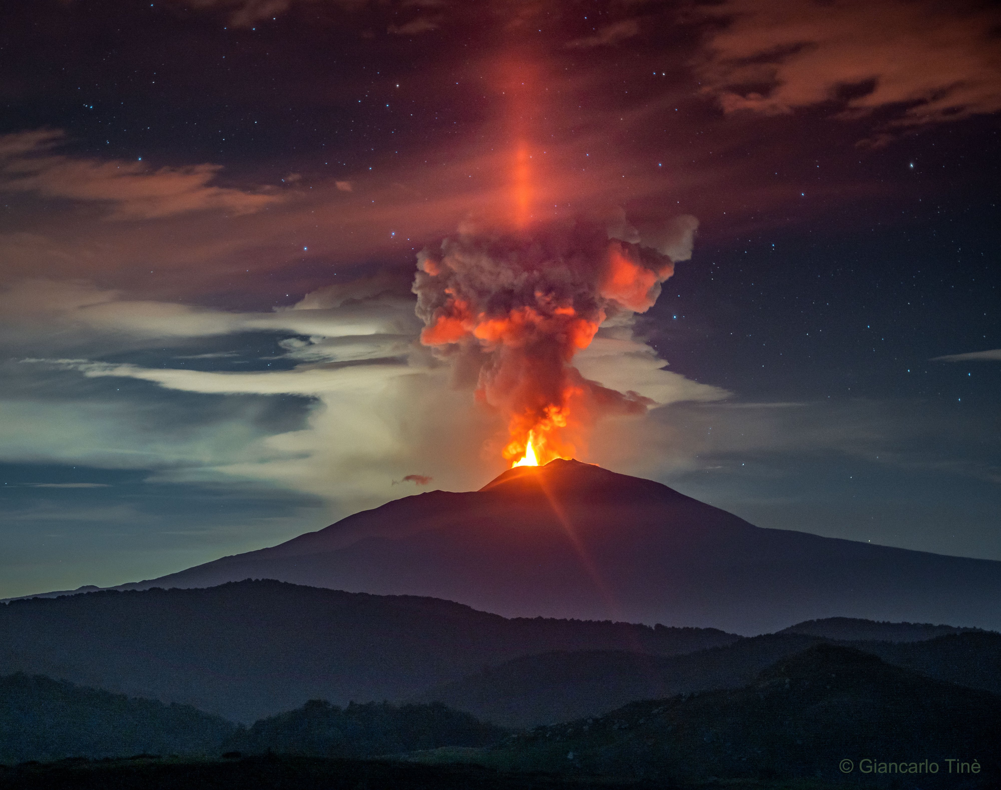 Yukarıdaki yanardağda neler oluyor? Oldukça ender bir olay… Bir volkanik ışık sütunu. Genelde ışık sütunları doğmakta ya da batmakta olan Güneş‘in tepesinden gökyüzüne uzanacak şekilde görülür. Fakat buna ek olarak bazen sokak lambaları ya da evden çıkan ışıkların da ışık sütunlarını oluşturduğu görülmüştür (bazıları baya renklidir). Fakat bu görseldeki ışık sütunu, patlamakta olan yanardağdan çıkan sıcak magma tarafından etrafa saçılan kırmızı ışık sayesinde oluşuyor. Buradaki yanardağ, İtalya‘daki meşhur Etna Yanardağı. Tek bir kareden oluşan fotoğraf, Haziran ayı ortalarında Güneş hemen battıktan sonra çekilmiş. Yanardağın kül bulutunun üzerindeki dondurucu soğuk nedeniyle buz kristalleri ya sirüs bulutları (cirrus cloud) içerisinde oluştu ya da Etna Yanardağı tarafından saçılan yoğun su buharı tarafından oluşturuldu. Bu çoğu zaman yere düz bir şekilde konumlanmış buz kristalleri, yanardağın kalderasından çıkan ışığı yansıtarak bir ışık sütununu oluşturdular.
