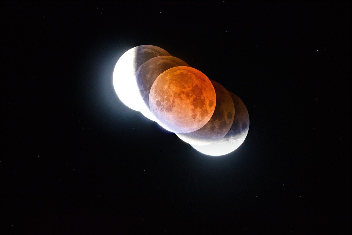Tıpkı bir koni gibi uzayda kendine yer bulan bu görselde, Dünya’nın karanlık merkezcil gölgesinin ya da umbrasının, çembersel kesiti görülüyor. Bu gölge, Ay’ın yörüngesi dolaylarında aslında Ay’ın kendisinden daha büyük. Fakat 18/19 Kasım’da gerçekleşen Ay tutulması sırasında, Ay’ın ufak bir kısmı bu gölgenin dışında kaldı. 5 ayrı fotoğraftan oluşan ve 1.5 saatlik bir periyotta elde edilen bu kompozit görsel, neredeyse tam Ay tutulmasını bizlere gösteriyor. Seri halinde çekilen bu görseller, gölgenin dairesel kesitlerini çakıştıracak biçimde hizalanmış. Merkezdeki görselde yalnızca incecik kalmış, Ay’ın parlak bölgesi, dairesel gölgenin kenarından kendini belli ediyor. Elbette gölgenin kendisi de aslında onu tamamen karanlık yapmıyor. Dünya’nın atmosferinden saçılarak geçen ışık, Ay’daki gölgenin üzerine kırmızı tonları aktarıyor.
