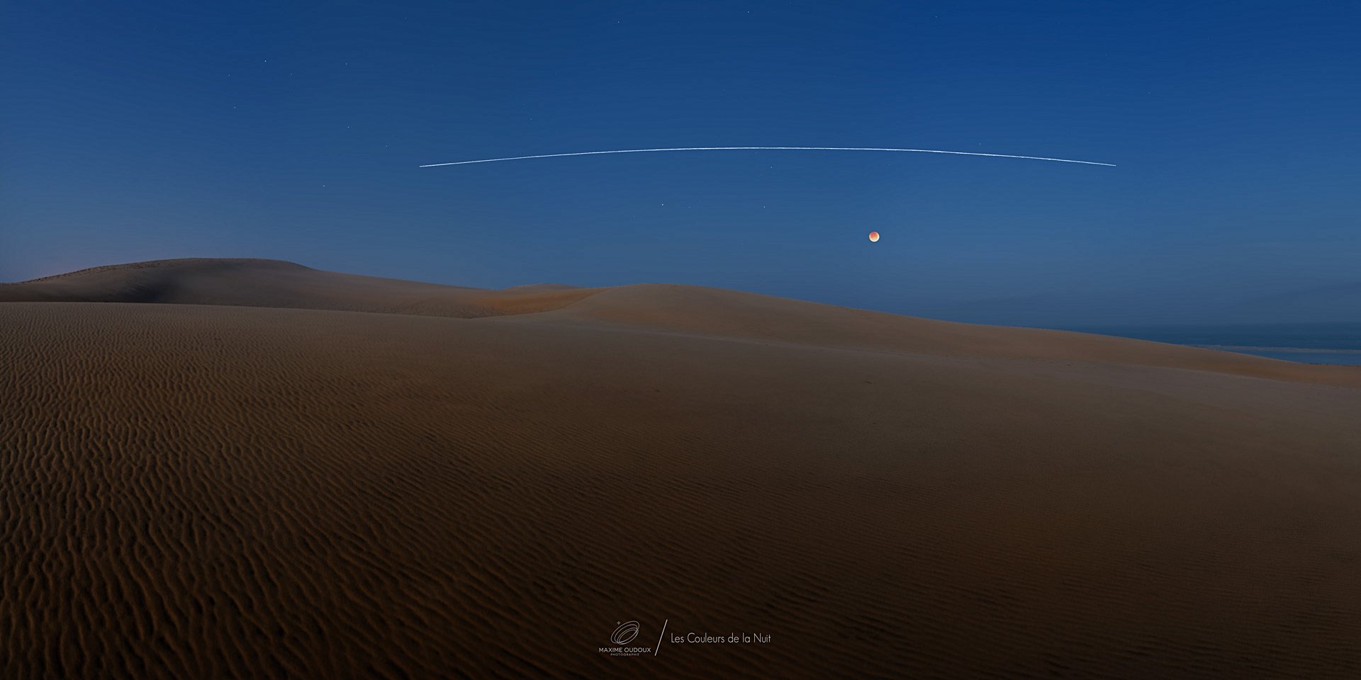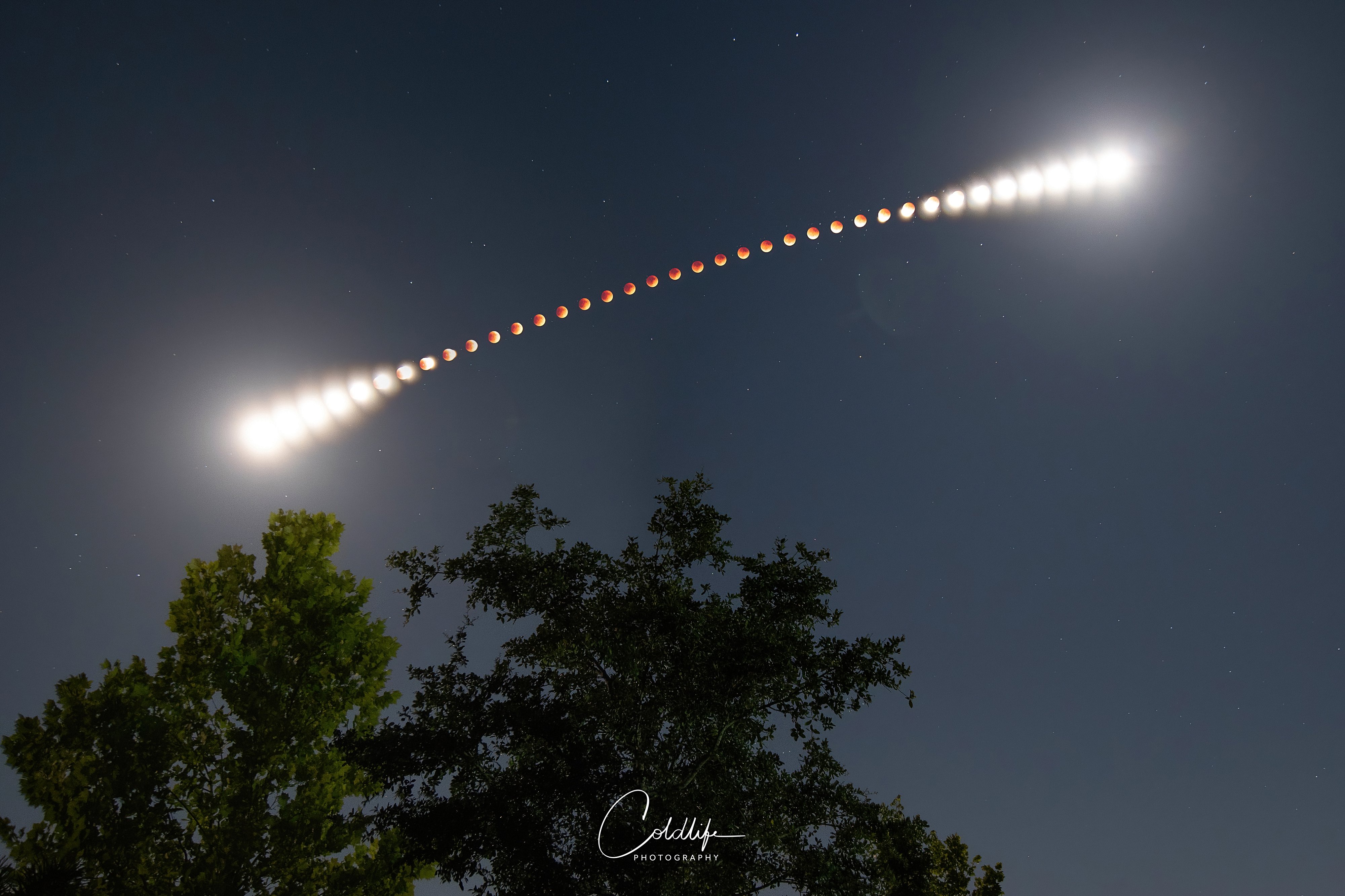 Recorded on May 15/16 this sequence of exposures follows the Full Moon during a total lunar eclipse as it arcs above treetops in the clearing skies of central Florida. A frame taken every 5 minutes by a digital camera shows the progression of the eclipse over three hours. The bright lunar disk grows dark and red as it glides through planet Earth's shadow. In fact, counting the central frames in the sequence measures the roughly 90 minute duration of the total phase of this eclipse. Around 270 BC, the Greek astronomer Aristarchus also measured the duration of total lunar eclipses, but probably without the benefit of digital watches and cameras. Still, using geometry he devised a simple and impressively accurate way to calculate the Moon's distance in terms of the radius of planet Earth, from the eclipse duration.