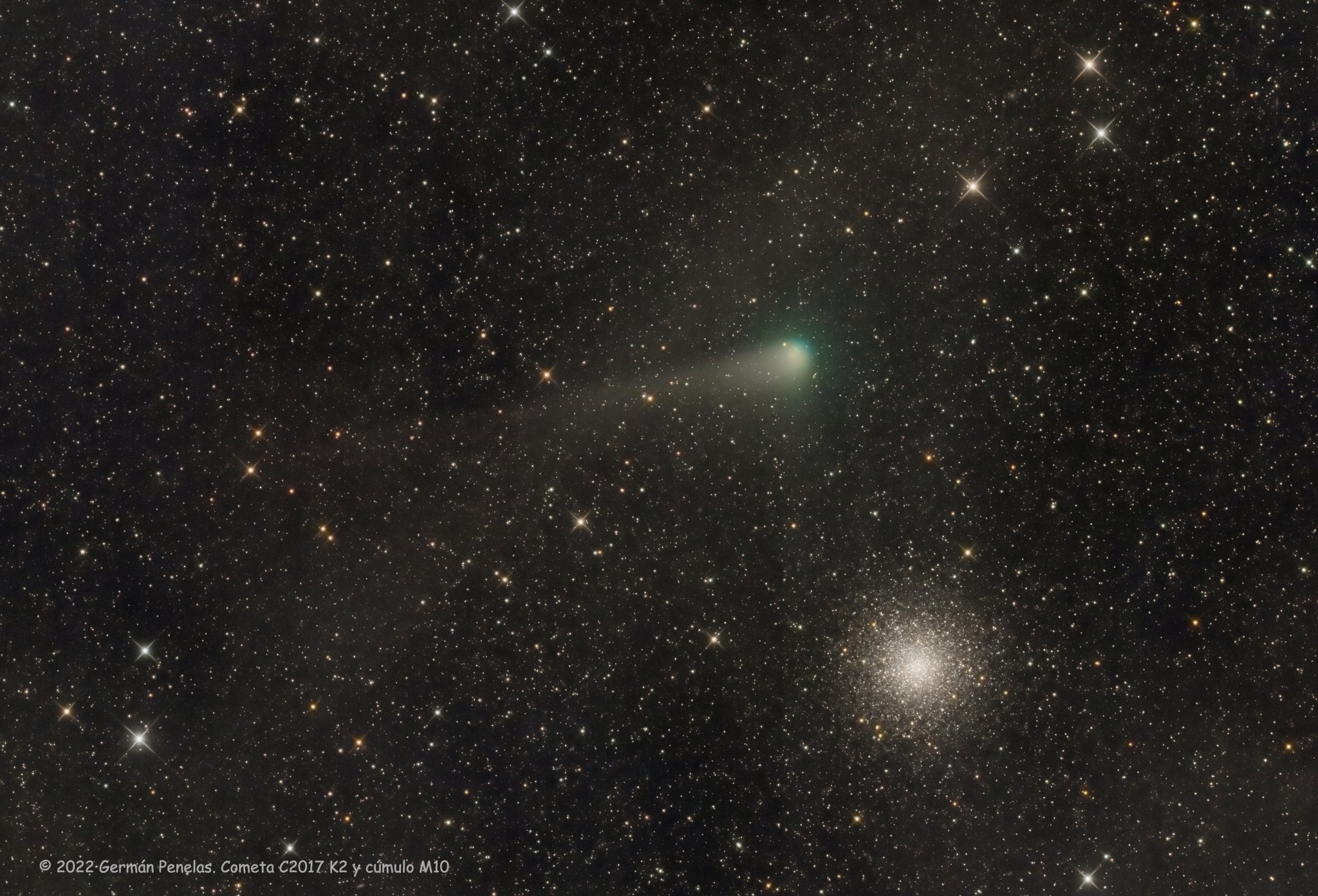 15 Temmuz 2022'de görüntülenen C/2017 K2 (PanSTARRS) kuyruklu yıldızı, teleskoptan alınan bu geniş gökyüzü alanını, küresel yıldız kümesi Messier 10 ile paylaştı. M10, 18. yüzyılın kuyruklu yıldız avcısı Charles Messier tarafından hazırlanan Messier kataloğundaki 10. nesnedir. Ancak bu katalogdaki nesneler kuyrukluyıldız değildir. M10 yaklaşık 14 bin ışık yılı uzaklıkta yer alıyor. PanSTARRS kuyruklu yıldızı ise en yakın mesafeye ulaşacağı 14 Temmuz'a yaklaştığı esnada, gezegenimizden 15 ışık dakikası uzaklıkta bulunuyordu. Yeşilimsi koması ve toz kuyruğuyla, 21. yüzyılın kuyruklu yıldız gözlemcilerini eğlendiren C/2017 K2'nin, kuzey yarımkürenin yaz semalarında teleskopla gözlenebilecek güzel bir nesne olarak kalması bekleniyor. PanSTARSS kuyrukluyıldızı, Güneş sistemimizin uzak bölgesindeki Oort Bulutu'ndan bize doğru yaptığı ilk yolculuğunda, Satürn yörüngesinin ötesindeyken keşfedildi. Bu da onu, bildiğimiz en uzaktan gelen aktif kuyrukluyıldız yapmaktadır. Güneş'e en yakın yaklaşımı 19 Aralık'ta 1.8 astronomik birim içinde olacak ve Mars'ın yörünge mesafesinin ötesinde bulunacak.