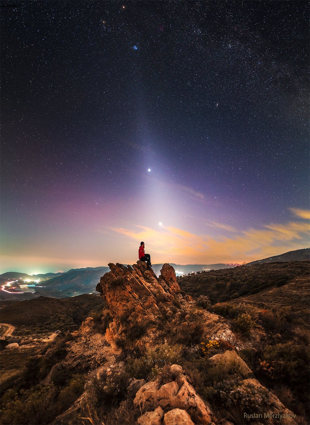 Why is a thin crescent moon never seen far from a horizon? Because the only geometry that gives a thin crescent lunar phase occurs when the Moon appears close to the Sun in the sky. The crescent is not caused by the shadow of the Earth, but by seeing only a small part of the Moon directly illuminated by the Sun. Moreover, the thickest part of the crescent always occurs in the direction of the Sun. In the evening, a thin crescent Moon will set shortly after the Sun and not be seen for the rest of the night. Alternatively, in the morning, a crescent Moon will rise shortly before the Sun after not being seen for most of the night. Pictured two weeks ago, a crescent moon was captured near the horizon, just before sunrise, far behind remnants of the ancient Temple of Poseidon in Greece.