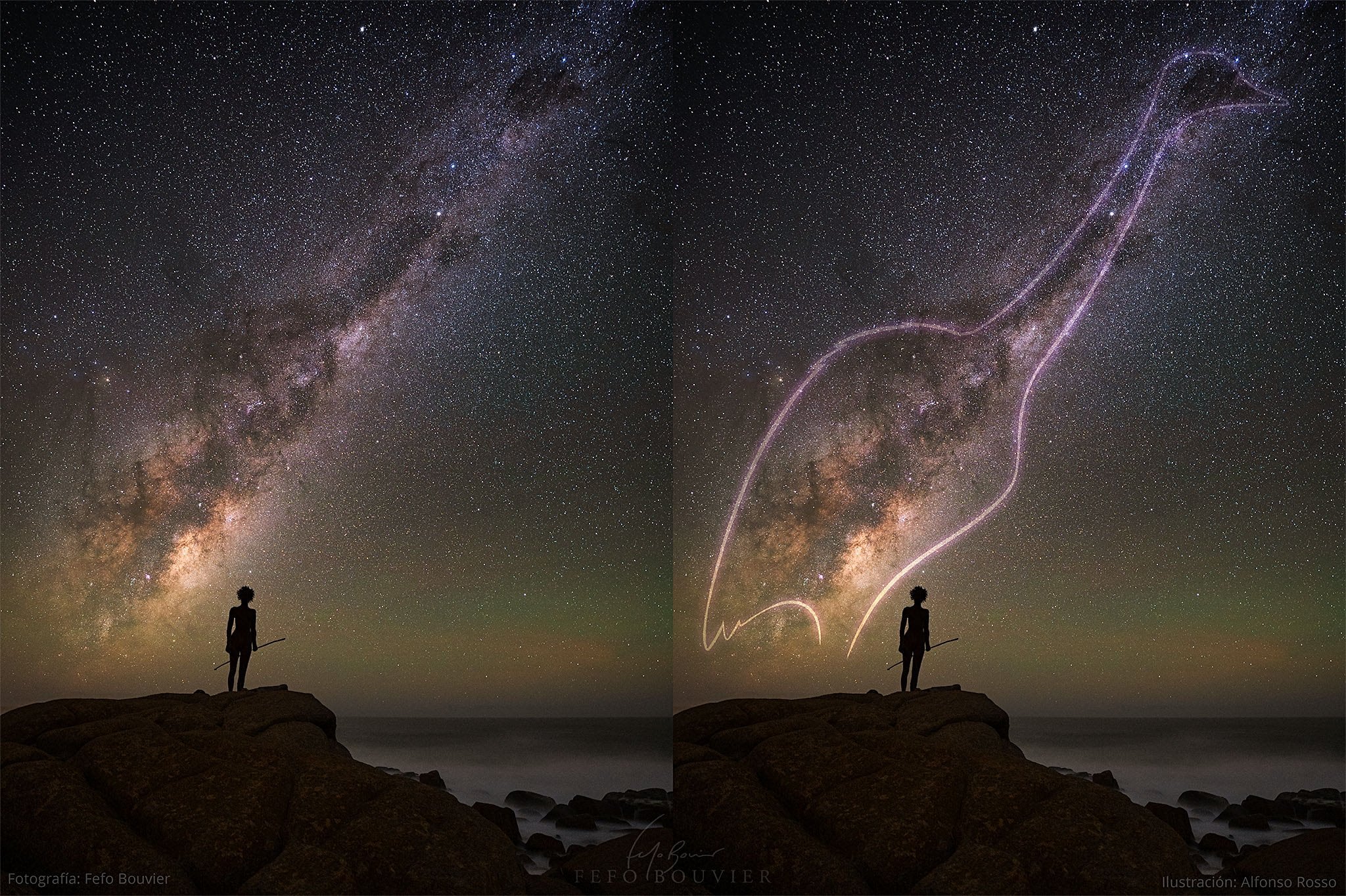 Samanyolu’ndaki kuşu gördünüz mü? Ay'daki adamın ötesinde, gece gökyüzü hikayelerle doludur ve tarih boyunca kültürler, en kalıcı efsanelerinden bazılarını yukarıdaki yıldızlara ve toza yansıtmıştır. Nesiller boyunca insanlar bu göksel imgeleri görüyor, ilgili hikayeleri duyuyor ve onları nesilden nesile aktarıyor. Görselde sadece Samanyolu galaksimizin merkez kuşağının bir parçası değil, Uruguay’ın birçok yerli folkloruna göre Ñandú adlı büyük bir kuşun ana hatları görülüyor. Ayrıca Ñandú'nun ayak izi, Güney Haçı asterizmiyle ilişkilendiriliyor. Ön plandaysa, 1800'lerde yaşamış ve sömürge direnişinin bir sembolü olarak varlığını sürdüren Charrúa halkının yerli bir kadını olan María Micaela Guyunusa'nın heykeli silüet halinde görülüyor. Bu kompozit görüntü, arka planda Atlantik Okyanusu'yla birlikte, nisan ortasında Uruguay, Cabo Polonio'da çekildi.