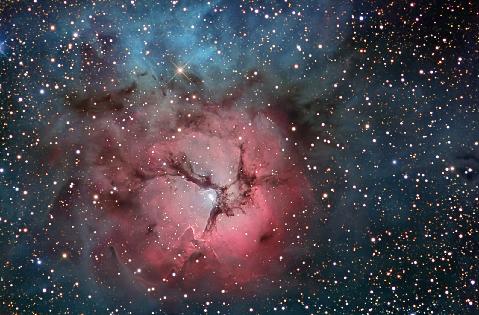 İlgi çekici bir etkileşim içerisinde olan gökada çifti Messier 51, Charles Messier'in ünlü kataloğundaki 51. nesnedir. Muhtemelen orijinal sarmal bulutsu, girdap benzeri sarmal yapıya sahip olan büyük gökada, karşıdan bakıldığı zaman NGC 5194 olarak kataloglanmıştır. Sarmal kolları ve toz şeritleri, kendisine eşlik eden diğer gökadanın (sağda), NGC 5195'in, önünden geçmektedir. Bizden yaklaşık 31 milyon ışıkyılı uzaklıkta ve Av Köpekleri takımyıldızının sınırları içinde yer alan M51, doğrudan teleskopla bakıldığı zaman soluk ve bulanık görünüyor. Ancak bu olağanüstü derin görüntü, gökada çiftinin çarpıcı renklerinin ve geniş gelgit enkazının çarpıcı ayrıntılarını gösteriyor. M51'in bu kesin galaksi portresini oluşturmak için Dünya'daki teleskopları kullanan fotoğrafçılar, 10 günlük pozlama süresiyle elde edilen görüntüleri bir araya getirdi. Görüntü, M51 sisteminde keşfedilen kırmızımsı iyonize hidrojen gazının geniş, parlak bir bulutunu da ortaya çıkaran 118 saatlik dar bant verilerini de içeriyor.