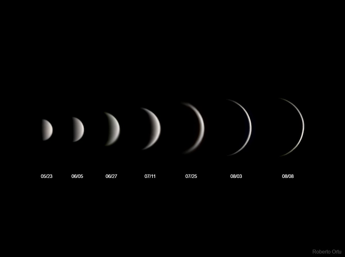 Ay'ın evrelerden geçmesi gibi Venüs'ün görünür, Güneş alan yarımküresi de büyüyüp küçülüyor. Bu teleskobik görüntü dizisi, Venüs'ün 2023 yılında akşam yıldızımız olarak ortaya çıkışı sırasındaki istikrarlı değişimlerini gösteriyor. Dünya ile Güneş arasındaki iç yörüngesinde süzülen Venüs, Dünya gezegenine yaklaştığı için bu dönemde büyüyor. Ancak iç gezegen Güneş'e olan görüş alanımıza yaklaştıkça hilal daralır. Dünya-Güneş çizgisine en yakın olan ancak Güneş'in yaklaşık 8 derece güneyinden geçen Venüs, 13 Ağustos'ta alt kavuşumuna ulaştı. Şimdi Venüs, şafak öncesi gökyüzünde doğu ufku üzerinde parlıyor ve Dünya gezegeninin sabah yıldızına geçişini tamamlıyor. 21 Ağustos tarihinde NASA'nın Parker Güneş Sondası, Venüs'ün altıncı kütleçekimi destekli uçuşunu tamamladı ve bu karşılaşmayı sondanın Güneş'e şimdiye kadarki en yakın yaklaşımına doğru manevra yapmak için kullandı.