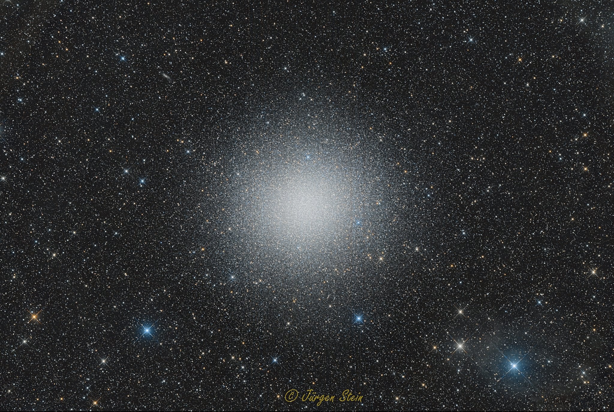 Küresel yıldız kümesi Omega Centauri, Güneş'ten çok daha yaşlı yaklaşık 10 milyon yıldızı 150 ışık yılı çapındaki hacmine sığdırıyor. NGC 5139 olarak da bilinen ve bizden 15.000 ışık yılı uzaklıkta olan küme, Samanyolu galaksimizin halesinde dolaşan bilinen 200 kadar küresel kümenin en büyüğü ve en parlağıdır. Çoğu yıldız kümesi aynı yaş ve bileşime sahip yıldızlardan oluşmasına rağmen bu gizemli yıldız kümesi, farklı yaşları ve kimyasal zenginlikleri olan farklı yıldız popülasyonlarına sahiptir. Aslında Omega Centauri, Samanyolu ile birleşen küçük bir galaksinin kalıntı çekirdeği olabilir. Sarımsı bir renge sahip olan Omega Centauri'nin kırmızı dev yıldızlarını bu keskin teleskopik görüntüde kolayca fark edebilirsiniz. Bu yoğun yıldız kümesi yirmi yıl boyunca Hubble Uzay Teleskopu ile incelendiğinde, Omega Centauri'nin merkezine yakın bir yerinde devasa bir karadeliğin olduğuna dair işaretler bulunmuştur.