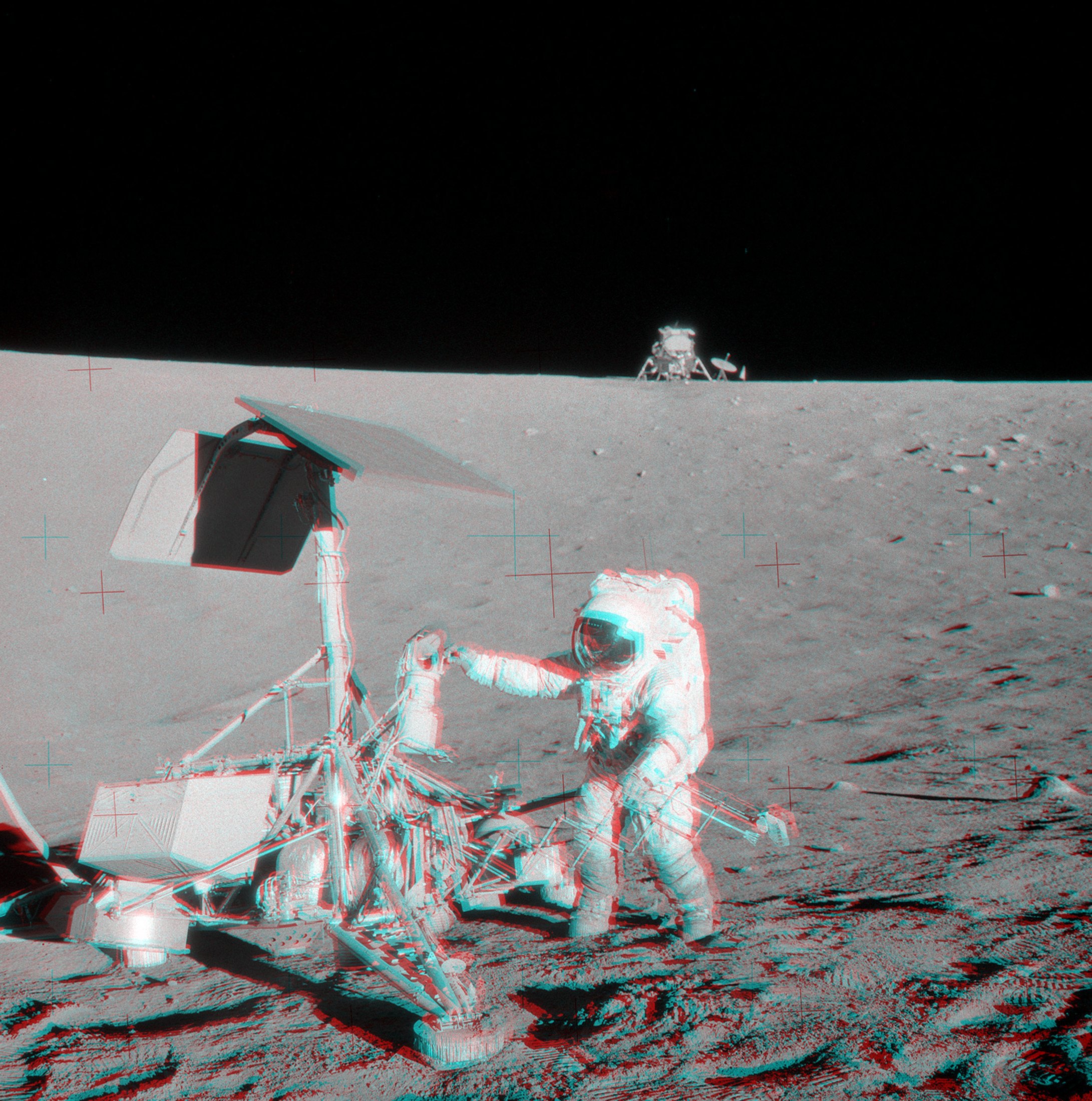 Kırmızı-mavi gözlüklerinizi takın ve Ay yüzeyinin batısında bulunan Fırtına Okyanusu'na bakın. Üç boyutlu anaglif tekniği kullanılan bu eser, Apollo 12 astronotu Pete Conrad'ın Kasım 1969’da Surveyor 3 uzay aracına yapmış olduğu ziyaretini gösteriyor. Surveyor 3, bu ziyaretten yaklaşık 2,5 yıl önce yani Nisan 1967’de küçük bir kraterin iç yamacındaki bir alana inişini gerçekleştirmişti. Uzak krater duvarının ötesinde, ufukta görülebilen Apollo 12'nin Ay Modülü Intrepid ise robotik Surveyor uzay aracının 200 metreden daha yakınına, yani kolaylıkla yürünebilecek bir mesafesine inmişti. O anları bize resmeden bu stereo görüntü ise Ay yüzeyinde çekilen ve manzarayı yaklaşık olarak insan gözleri arasındaki açıklığa denk gelecek kadar küçük seviyede farklı açılardan çerçeveleyen iki ayrı fotoğrafın (AS12-48-7133, AS12-48-7134) birleştirilmesiyle oluşturuldu.