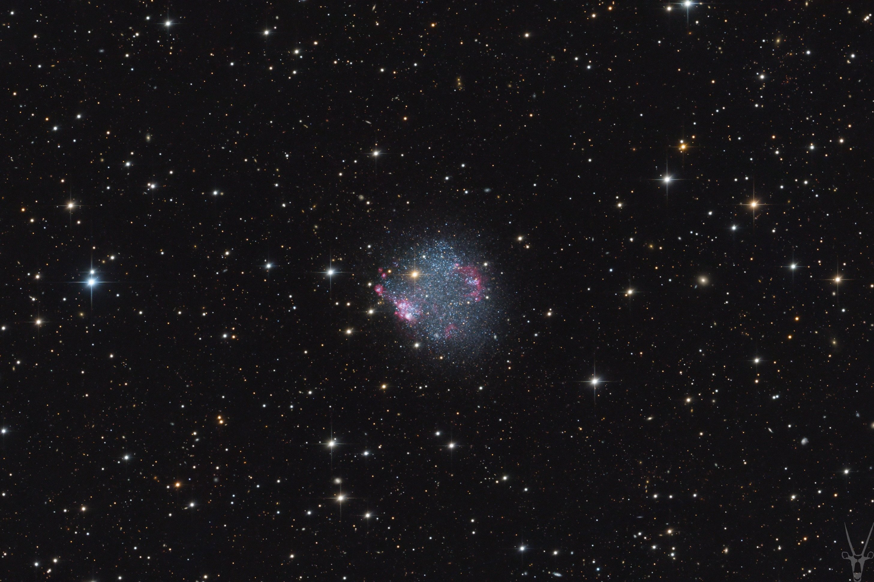 Grand spiral galaxies often seem to get all the attention, flaunting young, bright, blue star clusters and pinkish star forming regions along graceful, symmetric spiral arms. But small galaxies form stars too, like irregular dwarf galaxy Sextans A. Its young star clusters and star forming regions are gathered into a gumdrop-shaped region a mere 5,000 light-years across. Seen toward the navigational constellation Sextans, the small galaxy lies some 4.5 million light-years distant. That puts it near the outskirts of the local group of galaxies, that includes the large, massive spirals Andromeda and our own Milky Way. Brighter Milky Way foreground stars appear spiky and yellowish in this colorful telescopic view of Sextans A.