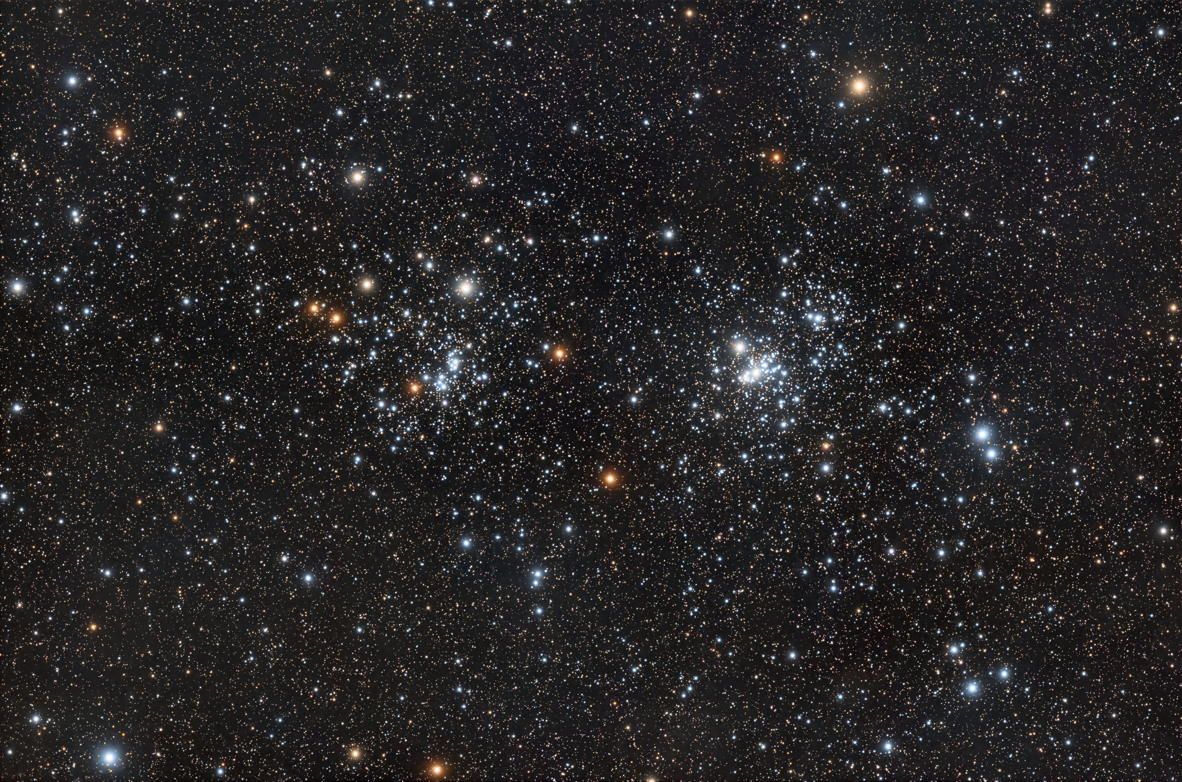 This stunning starfield spans about three full moons (1.5 degrees) across the heroic northern constellation of Perseus. It holds the famous pair of open star clusters, h and Chi Persei. Also cataloged as NGC 869 (right) and NGC 884, both clusters are about 7,000 light-years away and contain stars much younger and hotter than the Sun. Separated by only a few hundred light-years, the clusters are both 13 million years young based on the ages of their individual stars, evidence that both clusters were likely a product of the same star-forming region. Always a rewarding sight in binoculars or small telescopes, the Double Cluster is even visible to the unaided eye from dark locations.
