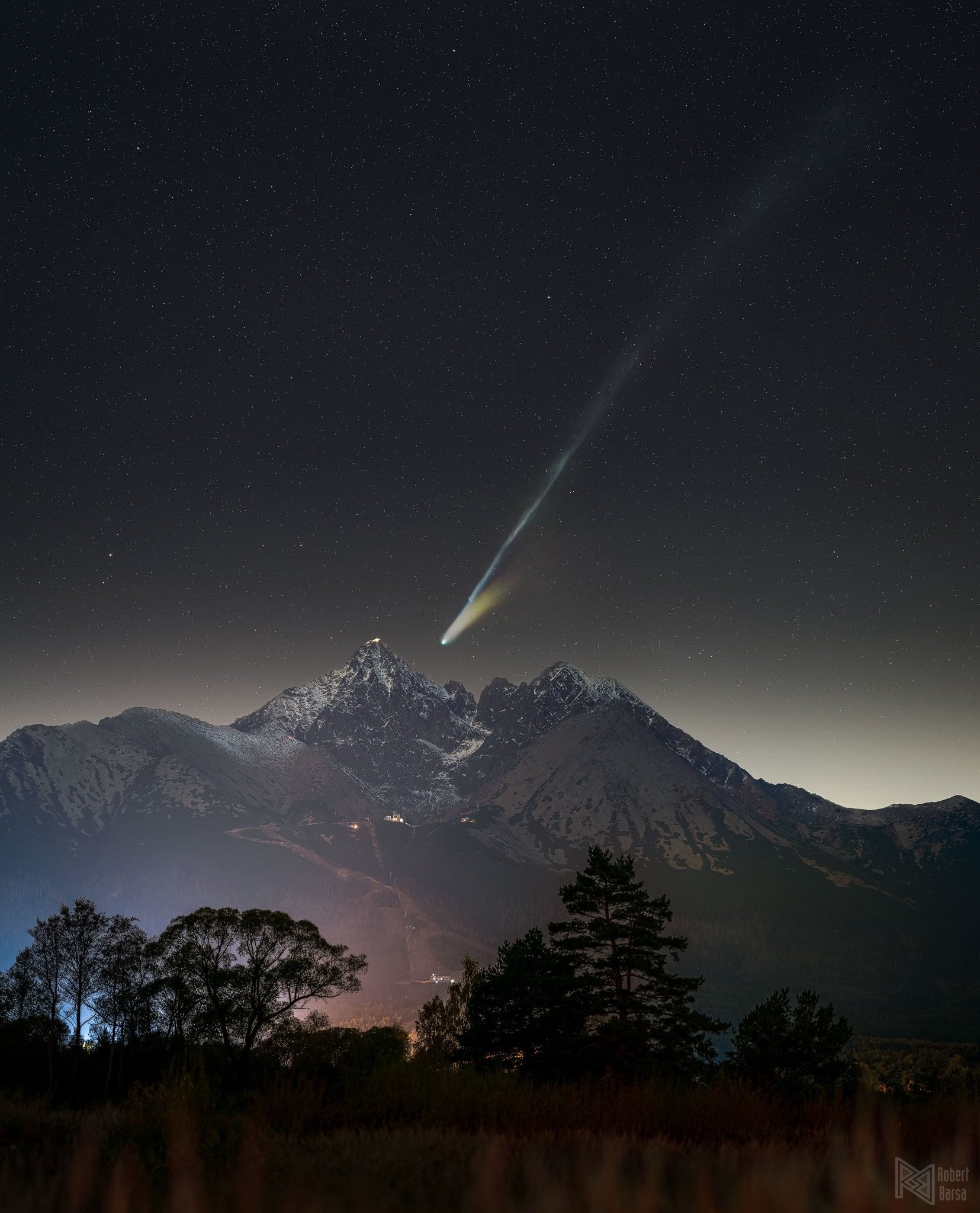 The image was timed to capture a total lunar eclipse -- but it came with quite a twist. First, the eclipse: the fully Earth-shadowed Moon is visible as the orange orb near the top. The eclipsed Moon's orange color is caused by a slight amount of red light scattered first by Earth's atmosphere, adding a color like a setting Sun. Now, the twist: one of the apparent double helix bands is the Milky Way, the central disk of our home galaxy. The second band is zodiacal light, sunlight scattered by dust in our Solar System. The reason they cross is because the plane where dust orbits our Sun is tilted relative to the plane where stars orbit our Galaxy. This well-known tilt is shown dramatically in the featured wide-angle Mercator-projected picture, spanning from horizon to horizon, captured in early September from Mingantu Observing Station in Inner Mongolia, China.