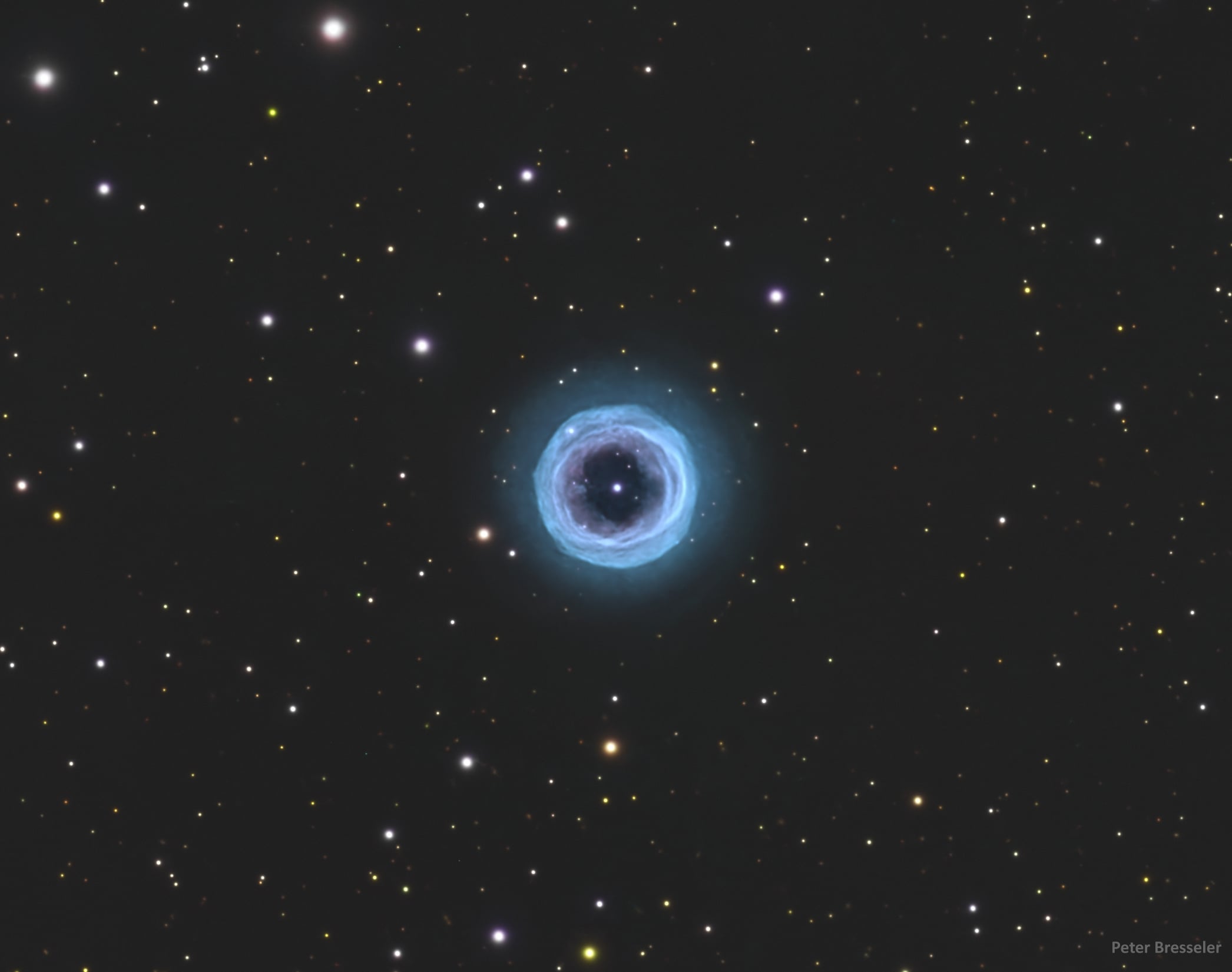 Size bakan şey kozmik bir göz değil; son derece simetrik, nefis bir Shapley 1 adlı gezegenimsi bulutsu. Fine Ring Nebula ya da PLN 329+2.1 olarak da bilinen Shapley 1, güney göğünün Carpenter's Square (Norma) takımyıldızında ışıldar. Bu bulutsu, Güneş’imize yakın kütlede bir yıldızın yakıtı tükenip dış katmanlarını uzaya savurmasının sonucudur. Bu atılan katmanlardaki parlayan oksijen, dairesel haleyi oluşturur. Ortadaki parlak nokta ise aslında bir ikilidir: Dış katmanlar uzaya saçıldıktan sonra geriye kalan yıldız çekirdeği olan bir beyaz cüce ve onunla birlikte, birbirlerinin etrafında 2,9 günde bir dolanan bir başka yıldız. Shapley 1’in halkalı görünümü, sistemi tepeden görmemizden kaynaklanır; ayrıca merkezdeki yıldızların gezegenimsi bulutsu yapılarını nasıl etkilediğine dair önemli ipuçları verir.