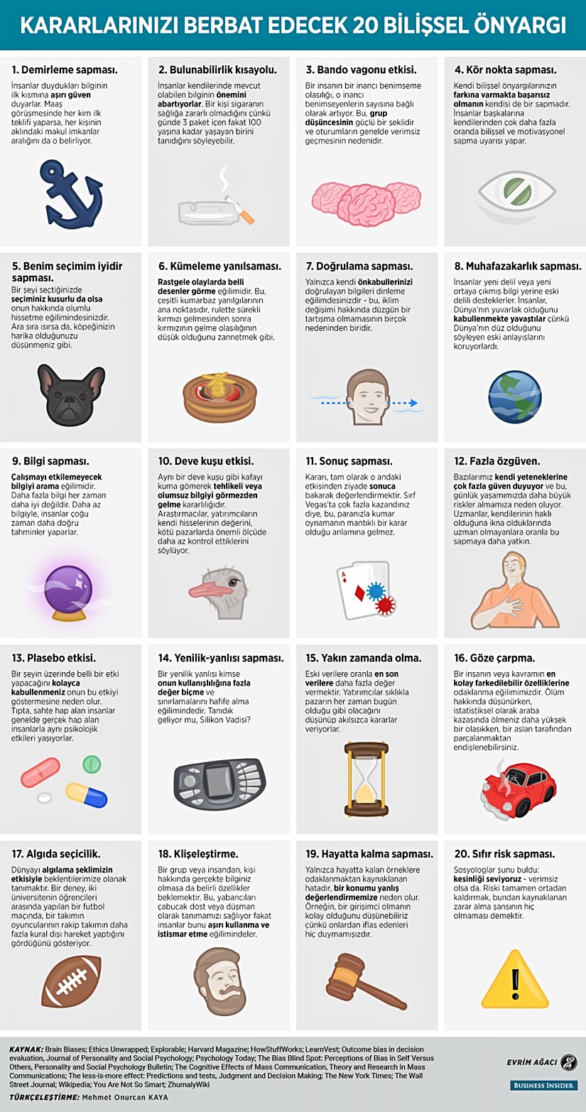 Aşağıdaki görselimizde, bilimsel olarak tespit edilip açıklanabilmiş 20 temel bilişsel önyargıya yer vereceğiz. Bunları bilmek, bir sonraki kararınızda çok daha ayakları yere basan bir adım atmanızı sağlayabilir.