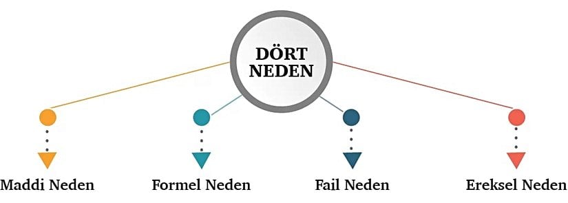 Aristoteles açısından, bir şeyin varlığa gelmesi için dört nedene ihtiyaç vardır. İlki, maddi nedendir; ikincisi formel neden, üçüncüsü hareket ettirici neden ve sonuncusu ereksel nedendir. Buna örnek olarak vazonun yapılışı verilebilir. Öncelikle madde gereklidir, vazo camdan yapılmaktadır, yani cam maddi nedendir; ikinci olarak maddenin bir forma(eidos) sahip olması gerekmektedir ki bu da formel nedendir; üçüncü olarak vazonun bir yapıcısı olmalıdır; son olarak da vazonun bir yapılış amacı, bir ereği olmalıdır. Varlıklar, bu dört neden sonucunda ortaya çıkmaktadır ama asıl olarak varlığı ortaya çıkaran “ousia”dır.