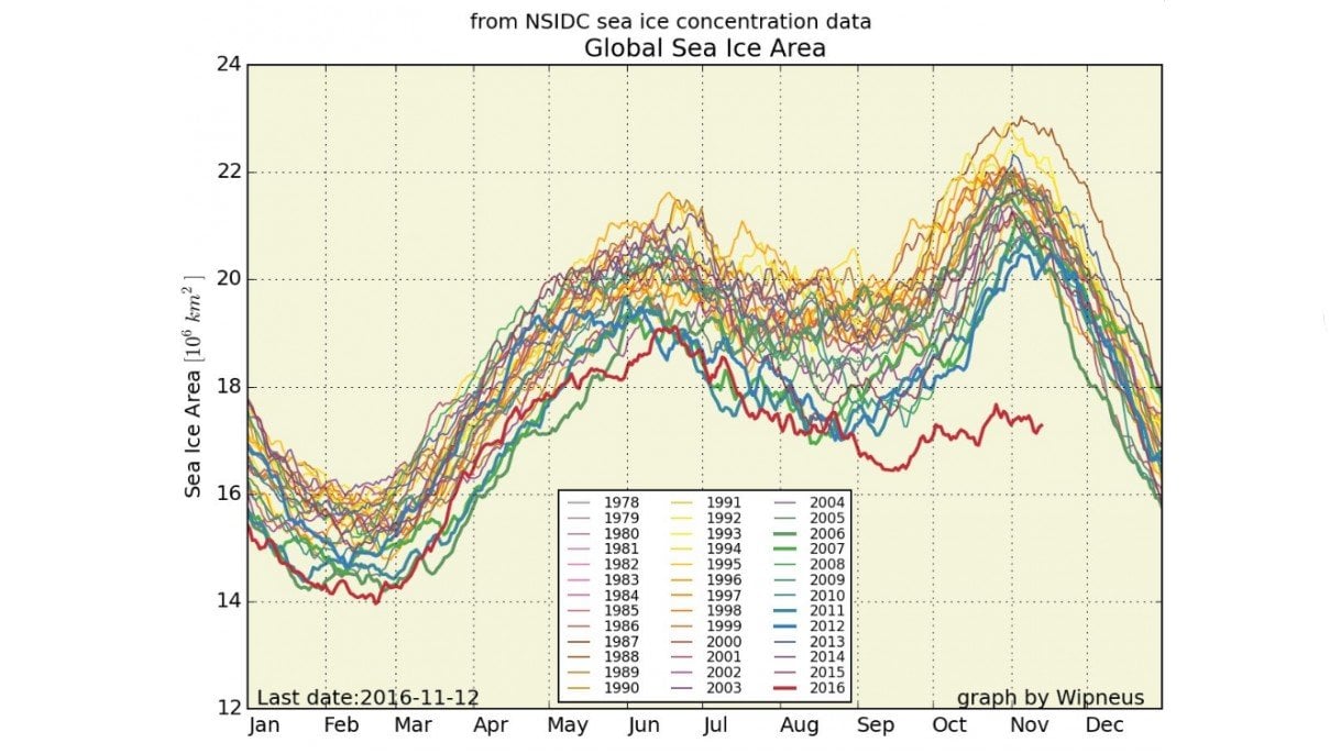 Ancak bu döngü hızla bozuluyor. Grafikten de görülebileceği gibi, yıllar geçtikçe döngü genel olarak daha alçak değerlere doğru kayıyor. Bu durum, deniz buzullarını yitirdiğimiz anlamına geliyor. En akıl almaz değişim ise 2012 yılında yaşandı: Buzullar, son 40 senede neredeyse hiç seyretmedikleri kadar düşük seviyelerde seyretmekle kalmadılar, aynı zamanda Ekim-Kasım aylarında hiç görülmemiş kadar düşük bir seviyeye (yaklaşık 3.4 milyon kilometre kareye) kadar düştüler!