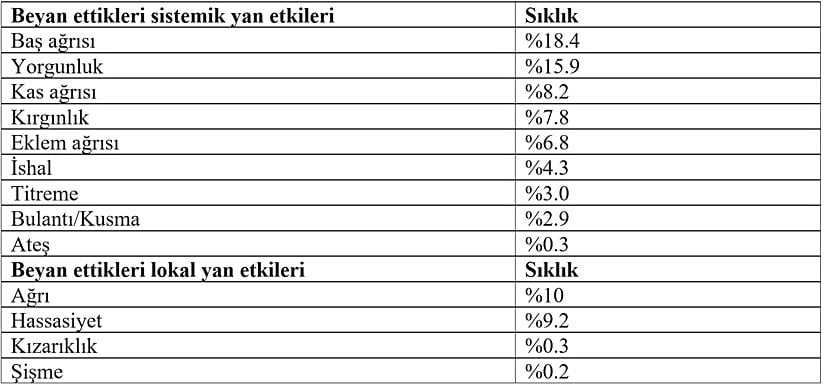 Plasebo grubunda 2. doz plasebo uygulaması sonrası yan etkiler ilk doza göre daha düşük oldu. Aşı grubunda ise tersi söz konusuydu.