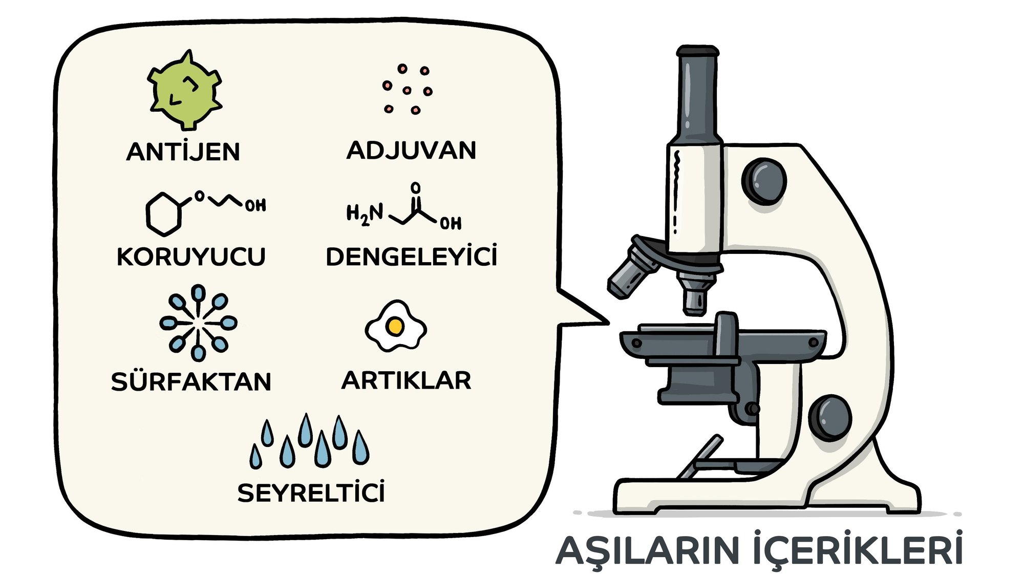 Aşılar hastalığa neden olan organizmanın küçük parçalarını veya küçük parçaların benzer kopyalarını içerir. Aşıyı güvenli ve etkili tutmak için, başka bileşenler de aşılara dahil edilir. Bu bileşenler, çoğu aşıda bulunur ve onlarca yıldır, milyarlarca doz aşının yapımında kullanılmaktadır. Her aşı bileşeni, belirli bir amaca hizmet eder ve bu bileşenlerin her biri üretim sürecinde test edilir; bu sayede tüm bileşenler, güvenlik açısından test edilmiş bir şekilde halka sunulur.