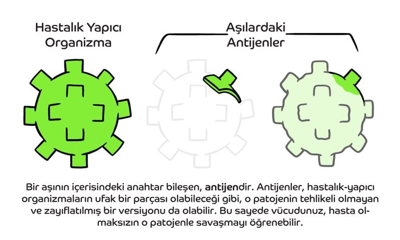 Vücudumuzun savunma sistemi, bu antijenleri tanıyarak bağışıklık tepkisi üretirler. Böylece zayıflatılmış bir halde patojeni alarak ve hatta patojenin tüm halini bile almaksızın, hastalık yapıcı mikroplara karşı direnç geliştirmeniz mümkün olur. Bunun en büyük avantajı, hastalığın tüm semptomlarını şiddetli bir şekilde yaşamaksızın direnç kazanabilmenizdir. Böylece ağır ve ölümcül hastalıklara hiçbir zaman yakalanmayabilirsiniz ve salgın hastalıkları da önlememiz mümkün olur.