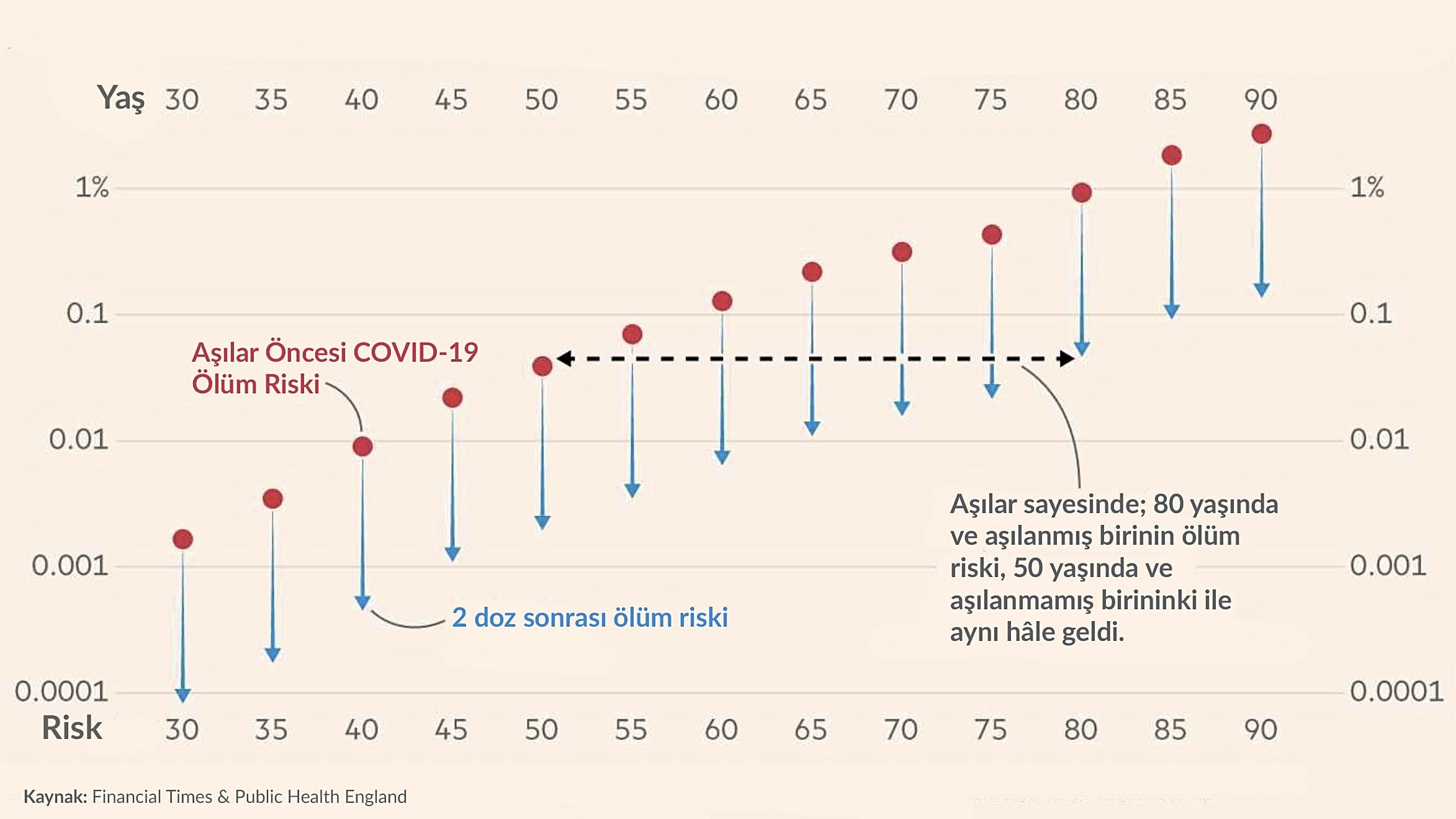 COVID-19 aşıları sayesinde artık 80 yaşındaki aşılı bir bireyin COVID-19 nedeniyle ölme riski, 50 yaşındaki aşısız biri ile eşit hâle geldi! Bu, ölüm riskinin 20 kat azalması demek!