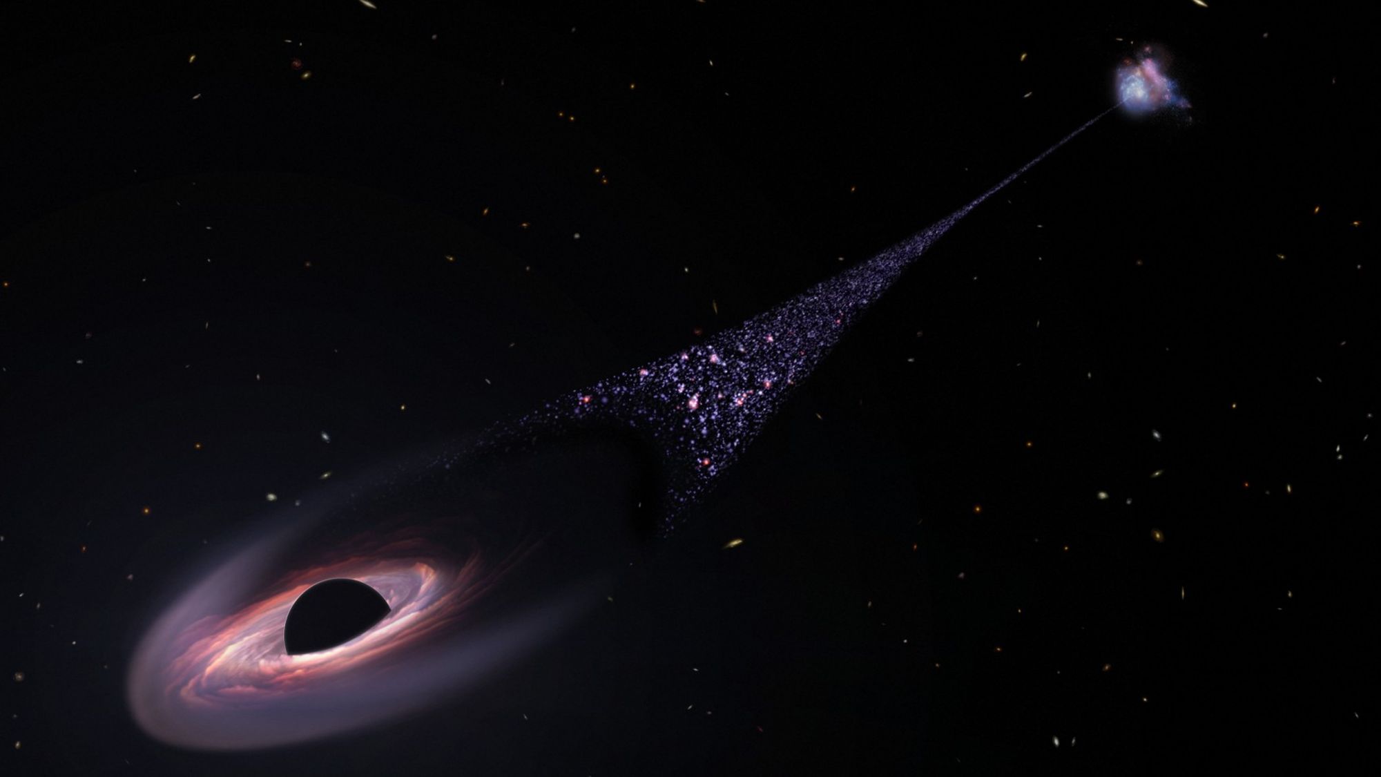 Geçtiğimiz günlerde astronomi alanındaki en ilginç keşiflerden birisi yapıldı. Galaksiler arası uzayda saniyede yaklaşık 1.600 kilometre hızla hareket eden 20 milyon Güneş kütleli bir kara delik, arkasında yeni doğmuş yıldızlardan oluşan ve 200.000 ışık yılı uzunluğunda olan devasa bir iz bıraktı. Yapılan araştırma, Astrophysical Journal Letters'da yayımlandı.[1]